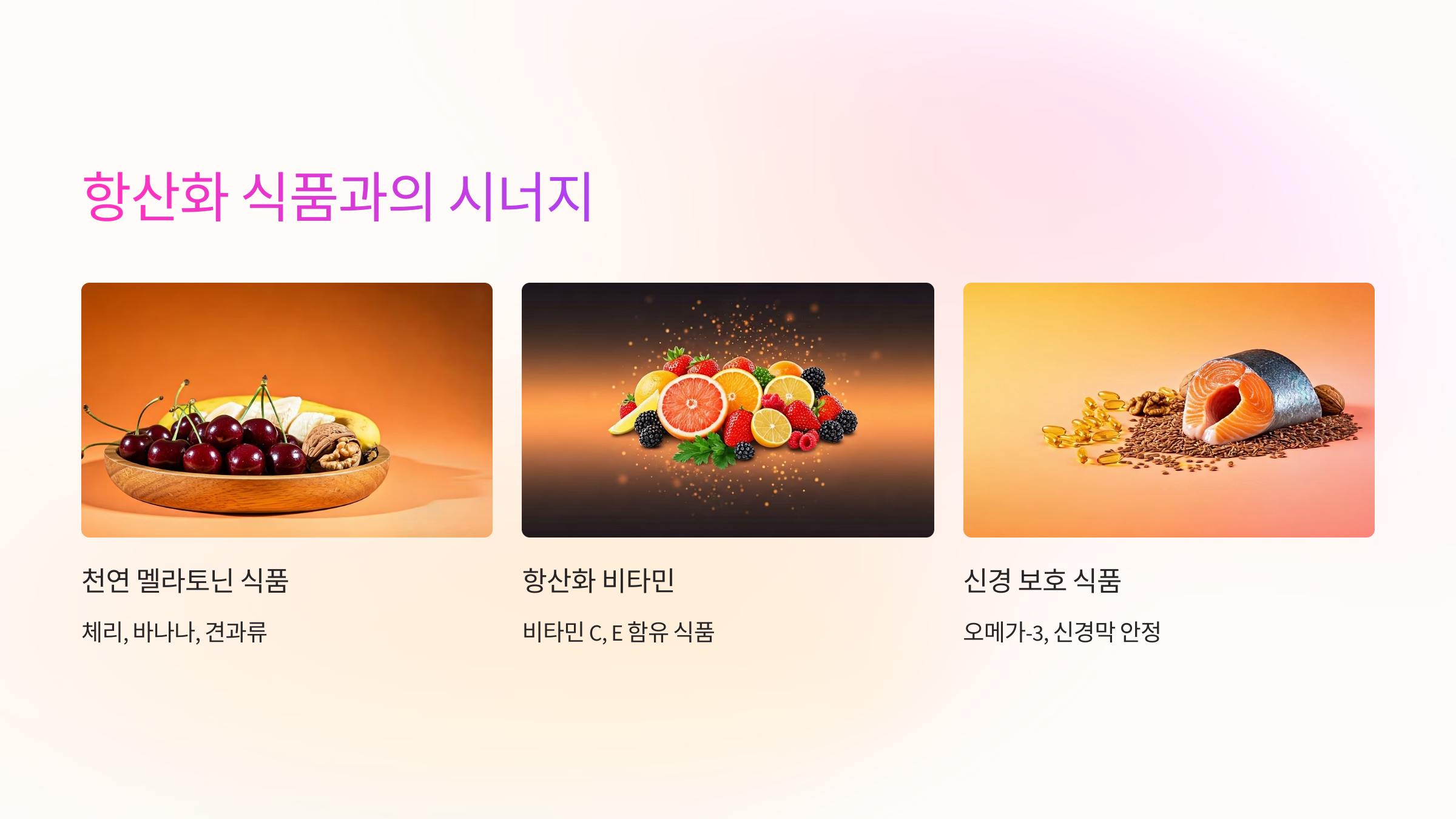 멜라토닌은 항산화 식품과 함께 섭취했을 때 더욱 강력한 시너지를 발휘해요. 특히 멜라토닌 생성을 돕는 트립토판 식품과 함께 항산화 비타민을 조합하면 면역과 뇌기능에 복합적인 효과를 얻을 수 있습니다.