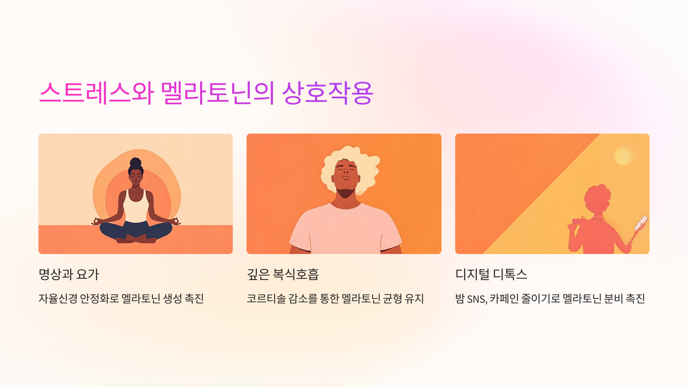 스트레스 호르몬 코르티솔은 멜라토닌의 분비를 억제하고, 멜라토닌 역시 코르티솔 과잉을 완화시키는 역할을 합니다. 만성 스트레스 상태에선 멜라토닌의 회복력이 중요한 열쇠가 돼요.