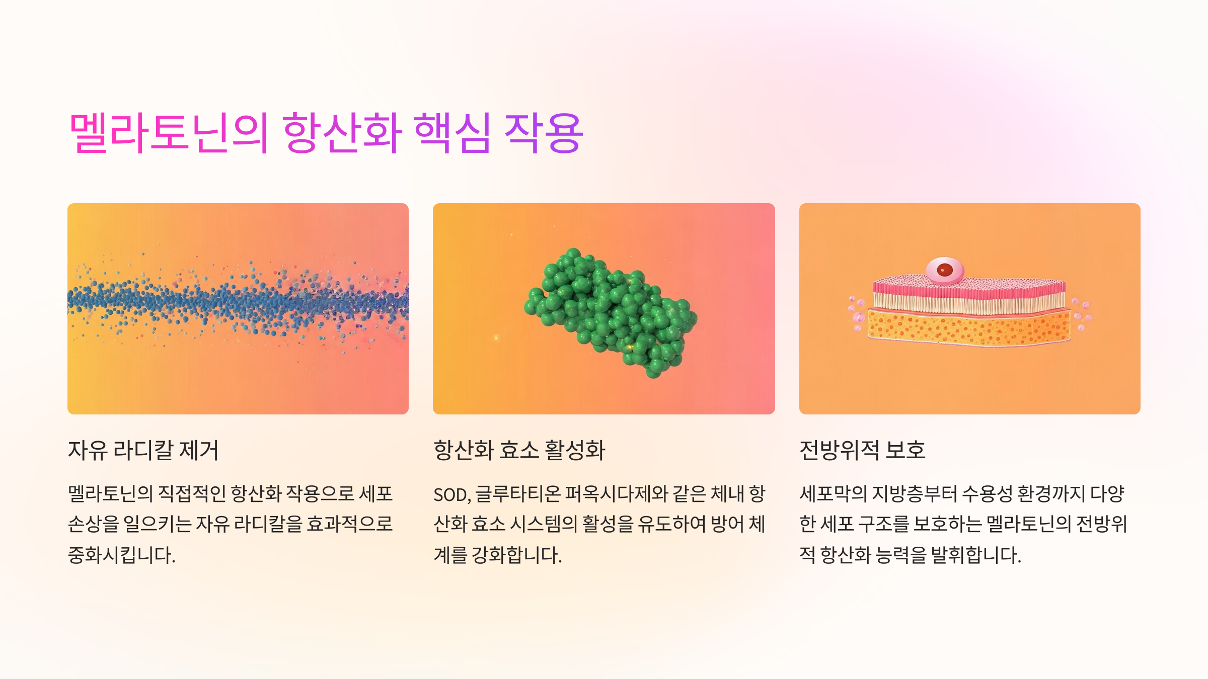 멜라토닌은 강력한 항산화 능력을 가진 호르몬입니다. 자유 라디칼을 직접 제거하는 동시에 항산화 효소(SOD, 글루타티온 퍼옥시다제 등)의 활성을 유도해 세포 손상을 막아줍니다. 특히 멜라토닌은 지방층, 수용성 환경 모두에서 작용할 수 있어 신체 전반에 보호막 역할을 해요.