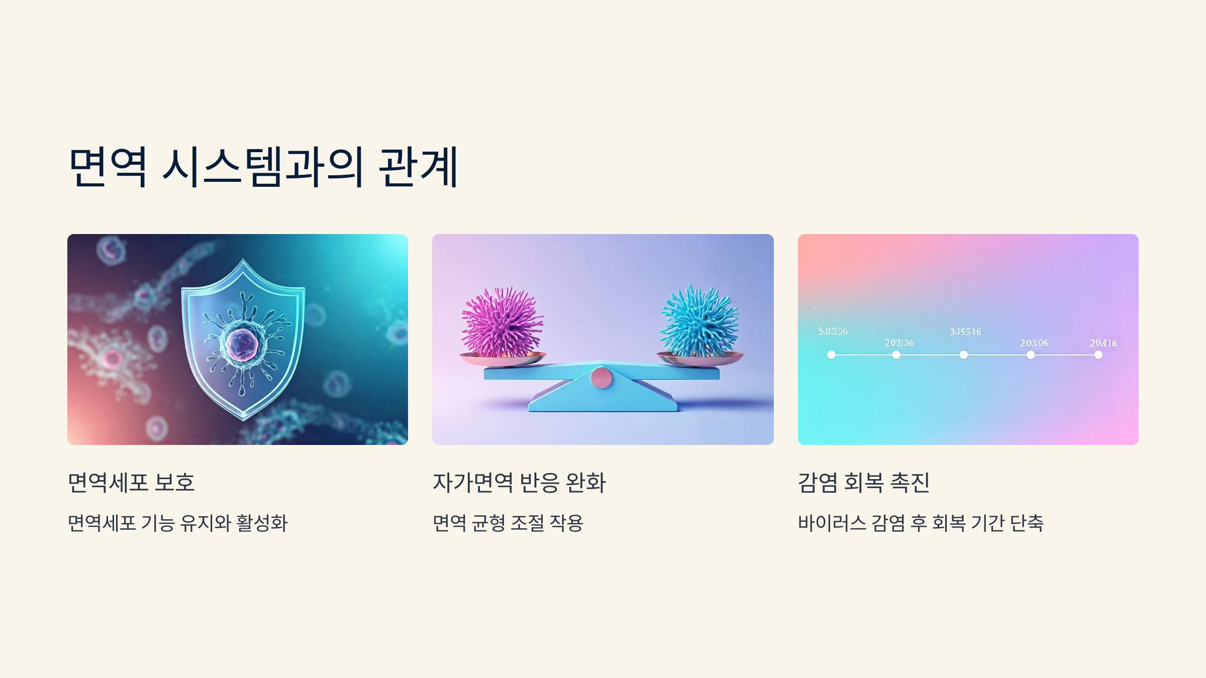 면역세포를 안정화하고, 염증 반응을 완화하여 자가면역과 감염 회복 모두에 긍정적인 영향을 줍니다.