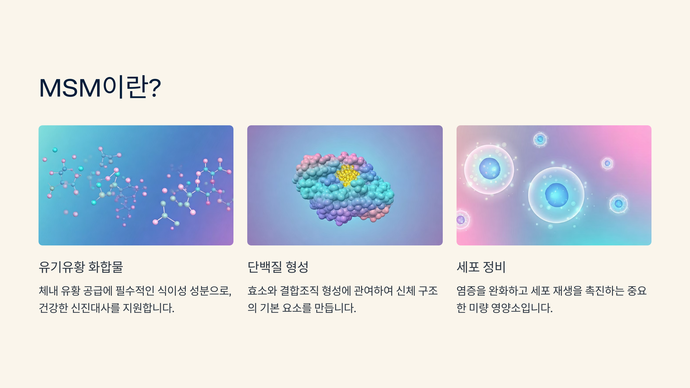 단지 관절 보충제라고요? MSM은 몸 전체의 염증을 낮추고, 항산화부터 면역력까지 지켜주는 전신 슈퍼 영양소입니다.