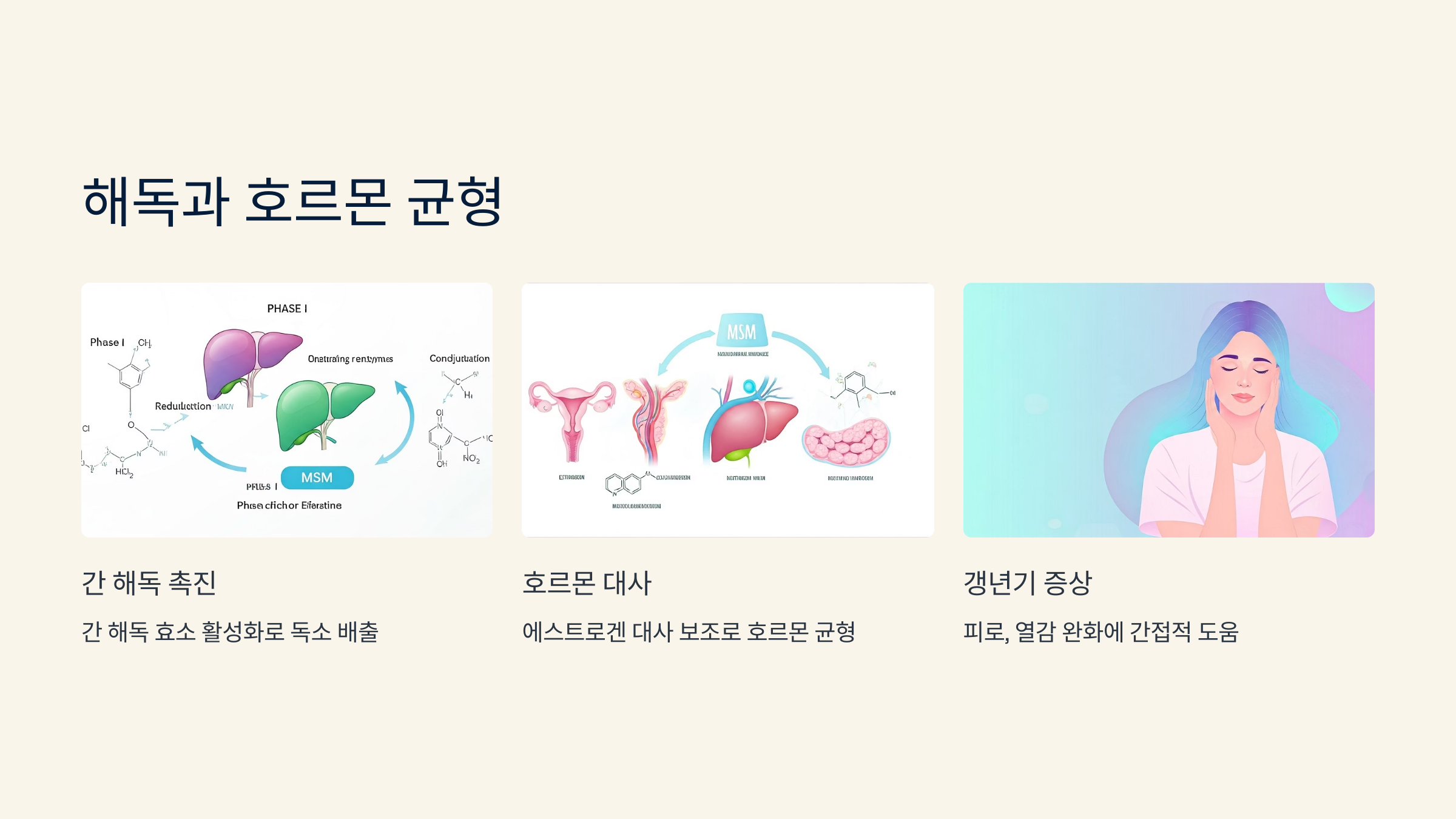 MSM은 간 해독 기능을 촉진하고, 호르몬 대사 효소에 관여해 에스트로겐 대사와 같은 내분비 균형에도 영향을 미칩니다. 특히 여성의 생리통, 갱년기 증상 완화에 간접적인 도움이 된다는 보고도 있어요.