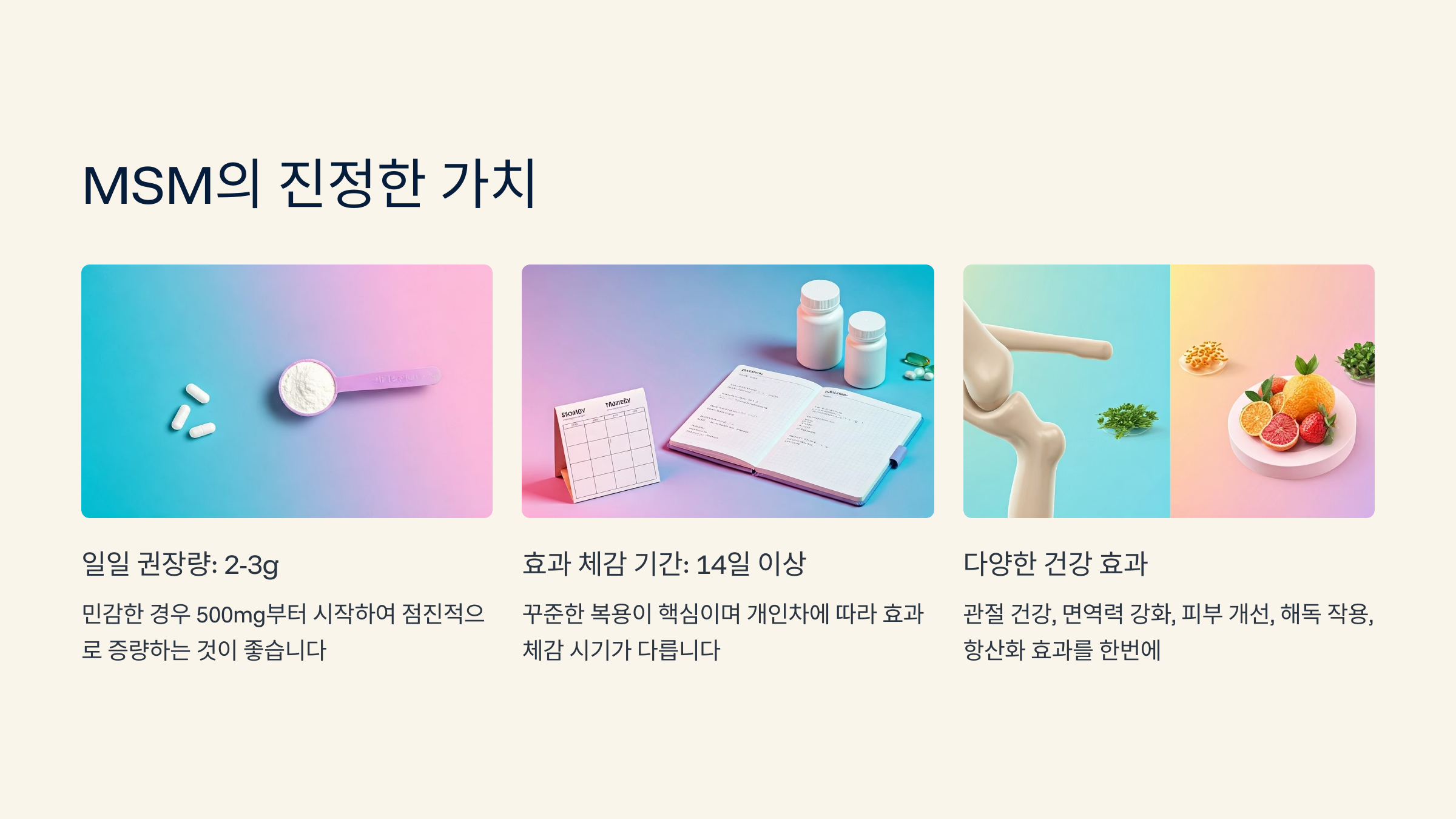 처음 MSM을 복용했을 때 ‘관절 보충제’라는 이미지에만 집중했지만, 몇 달이 지나고 나니 제 면역력과 회복력이 달라졌다는 걸 느꼈어요. 감기를 달고 살던 제가 겨울을 건강하게 보내고, 피부도 한층 부드러워졌죠. MSM은 단지 통증을 줄이는 게 아니라, 내 몸 전체의 균형을 잡아주는 영양소였어요. 꾸준한 복용, 그리고 나에게 맞는 루틴을 찾는 것. 이것이 MSM의 진짜 효과를 느끼는 첫걸음이에요. 오늘부터 당신의 루틴에도 MSM을 담아보세요.