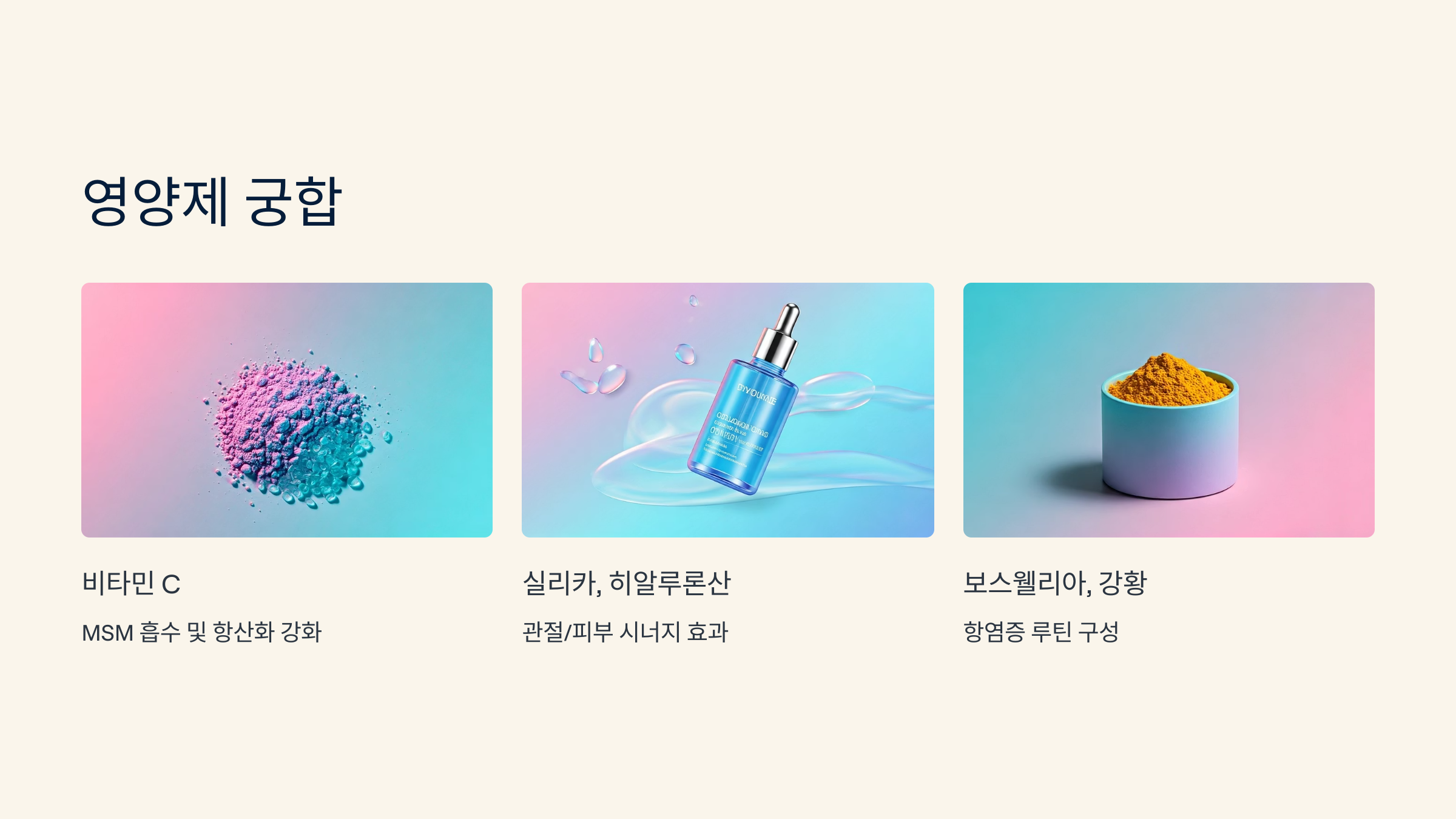 - 실리카, 히알루론산 → 관절/피부 시너지