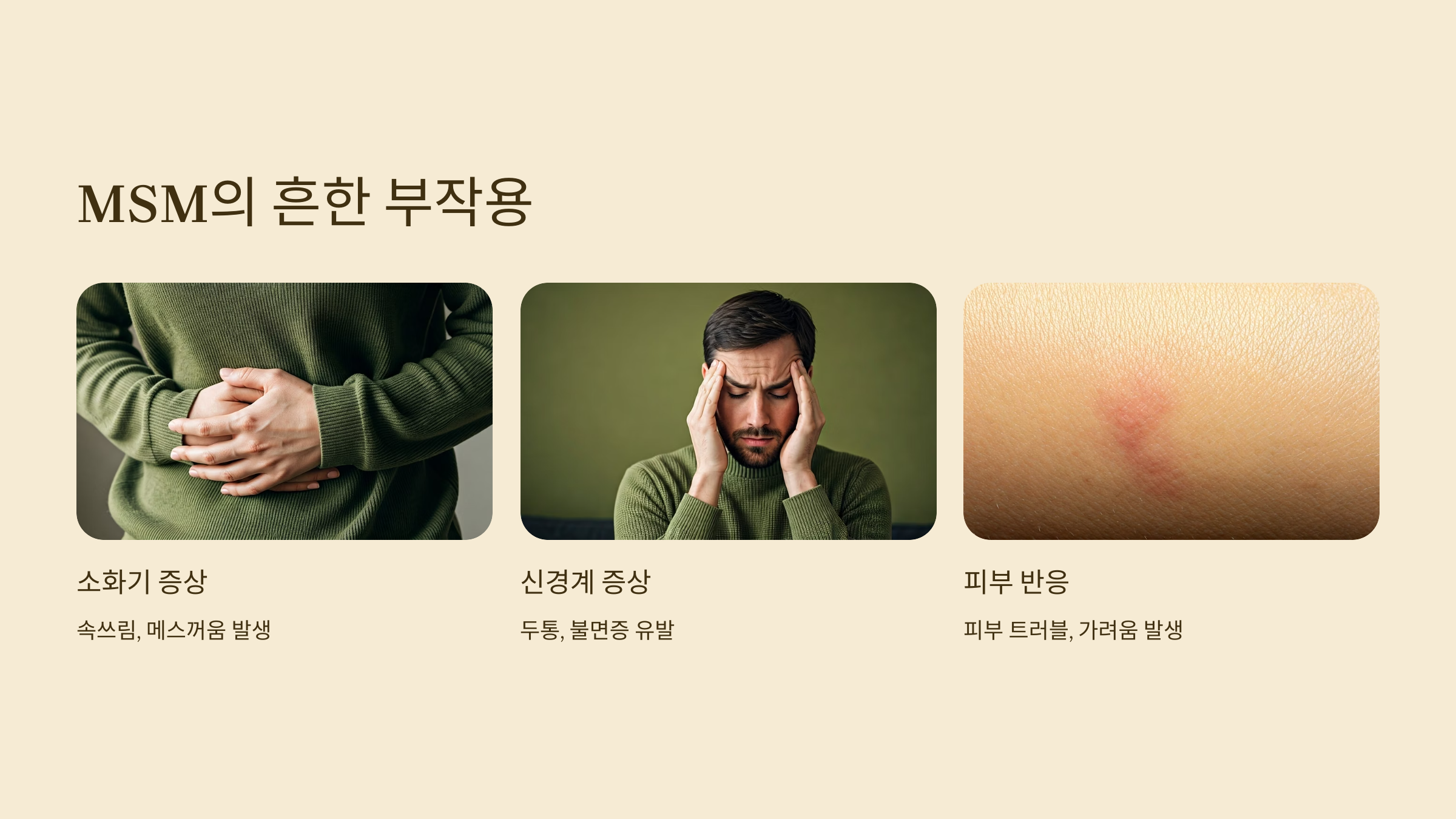 MSM은 대부분 안전하지만, 체질이나 복용 방식에 따라 다음과 같은 부작용이 나타날 수 있어요. 특히 처음 복용하는 사람이나 고용량 섭취자는 주의가 필요합니다.