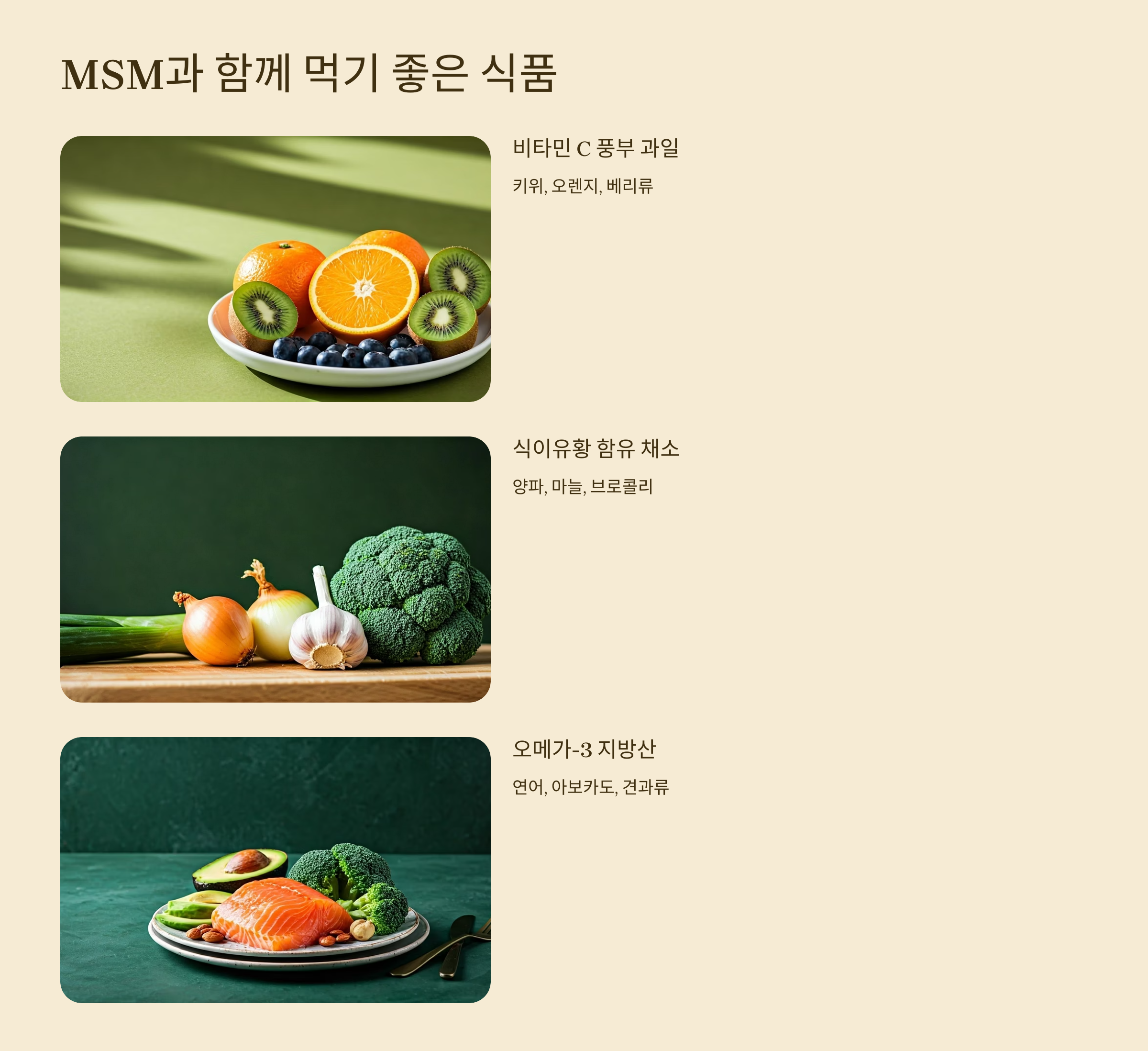 MSM은 천연 식품과 함께 먹으면 흡수율과 항염 효과가 더욱 높아져요. 특히 항산화 성분이 풍부한 음식들과의 궁합이 뛰어납니다.