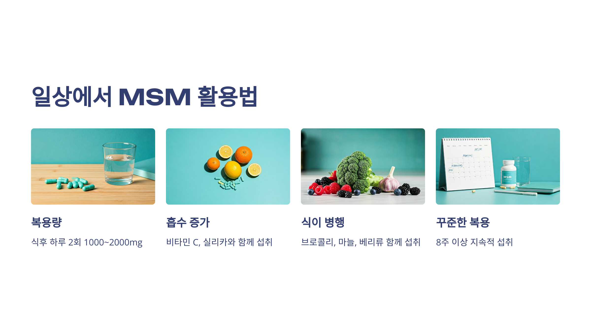 MSM은 매일 일정한 시간에 식후 섭취하는 것이 가장 효과적입니다. 특히 항염 식단과 병행하면 혈당, 소화, 면역, 에너지까지 다양한 효과를 경험할 수 있어요. 다음은 일상 속에서 MSM을 잘 활용하는 팁이에요.