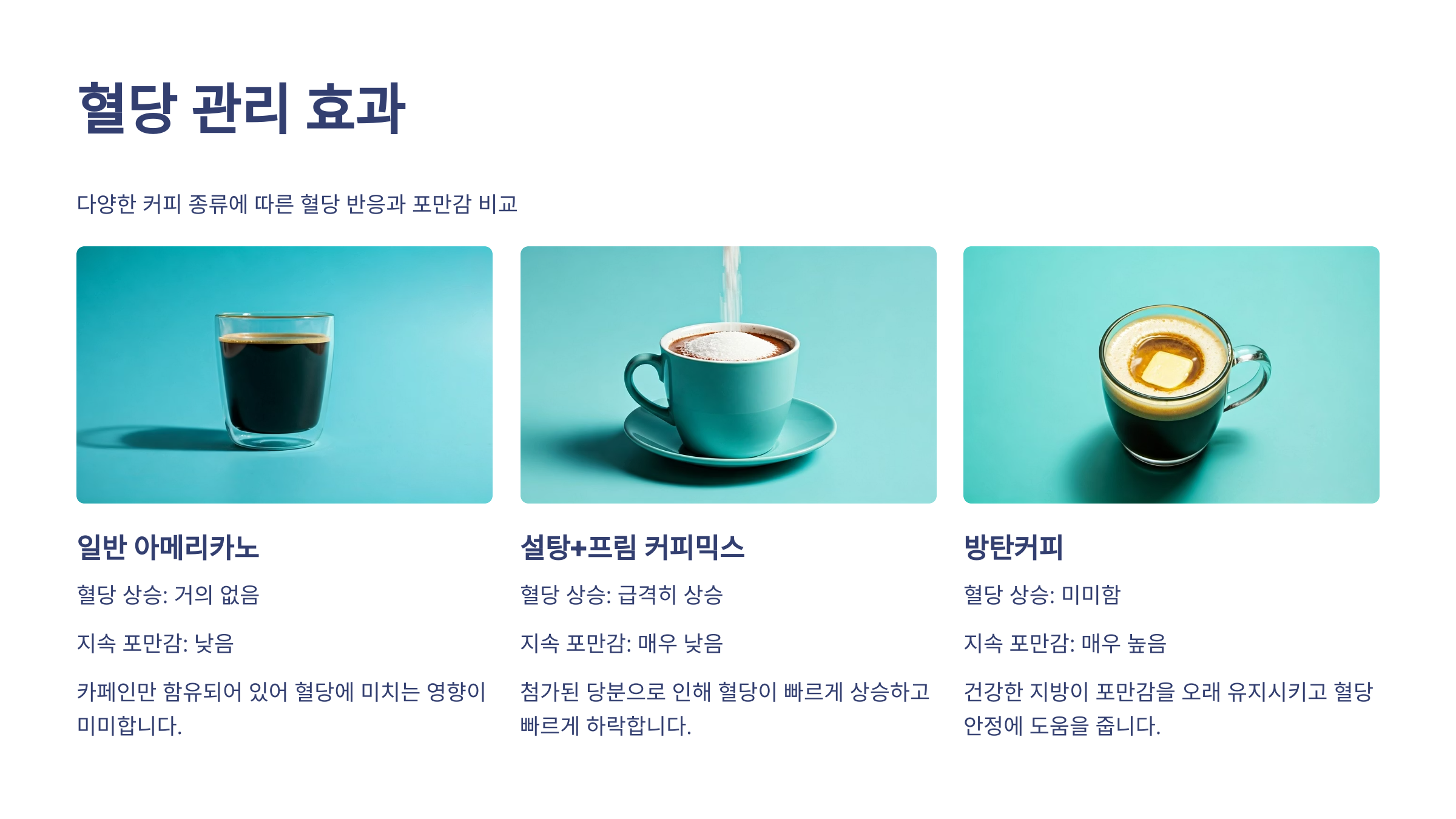 | 커피 종류 | 혈당 상승 | 지속 포만감 |