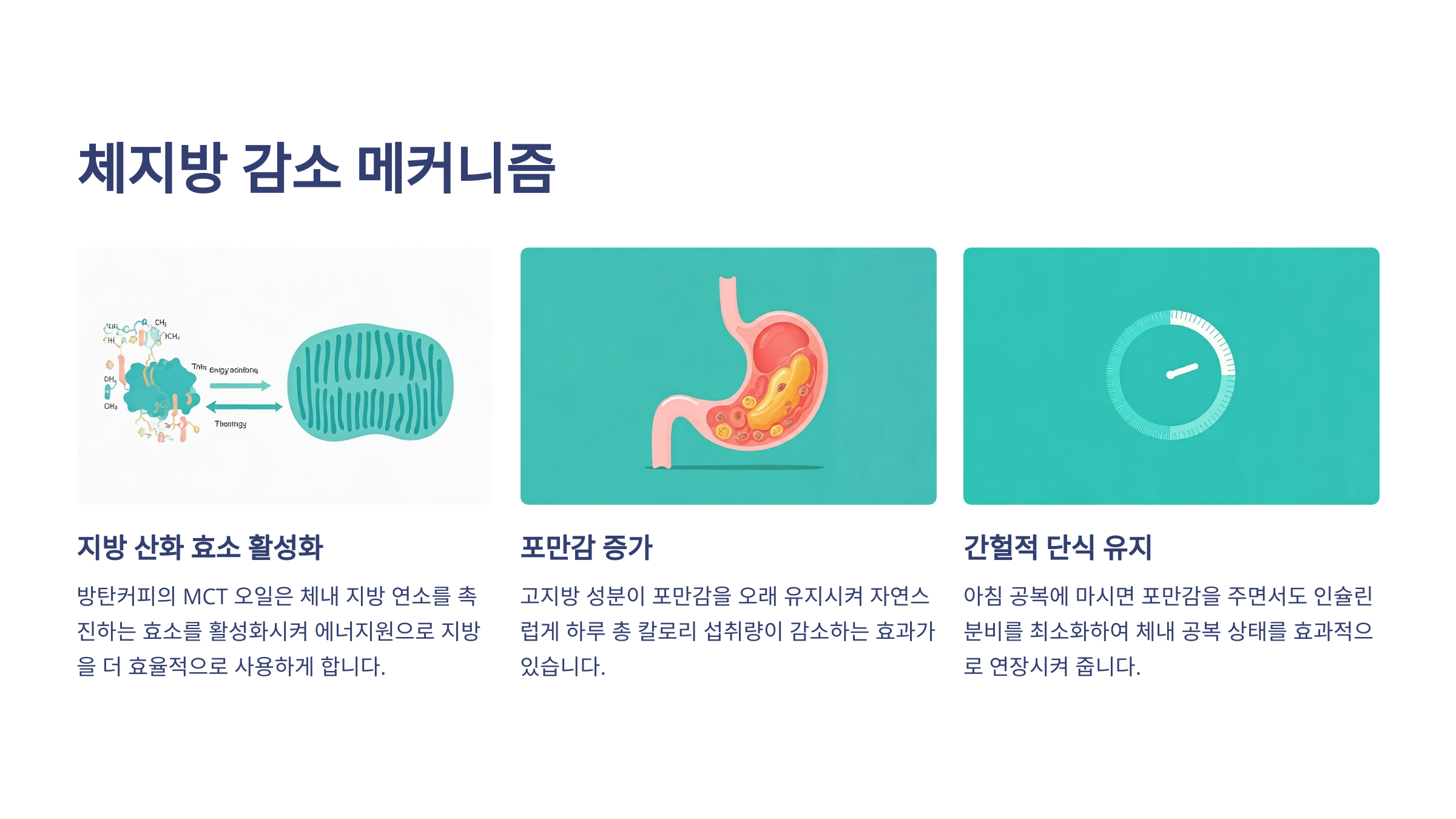 방탄커피가 체지방을 줄이는 데 도움을 주는 메커니즘은 꽤 논리적이에요. 공복 상태에서 마시면 인슐린을 자극하지 않고, 지방 연소를 촉진할 수 있는 환경을 유지해 줍니다. 특히 케토제닉 식단이나 간헐적 단식과 병행하면 그 효과는 더 커지죠. 아래는 그 주요 작용 메커니즘입니다.