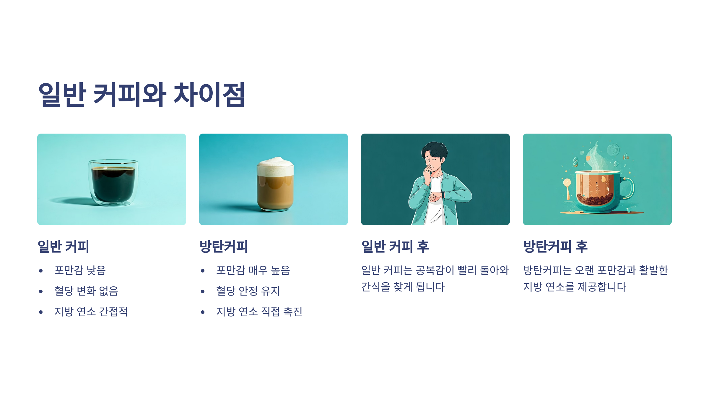 방탄커피와 일반 커피는 단순한 '첨가물 유무' 이상의 차이를 보여요. 영양학적 측면에서 완전히 다른 음료라 해도 과언이 아닙니다.
