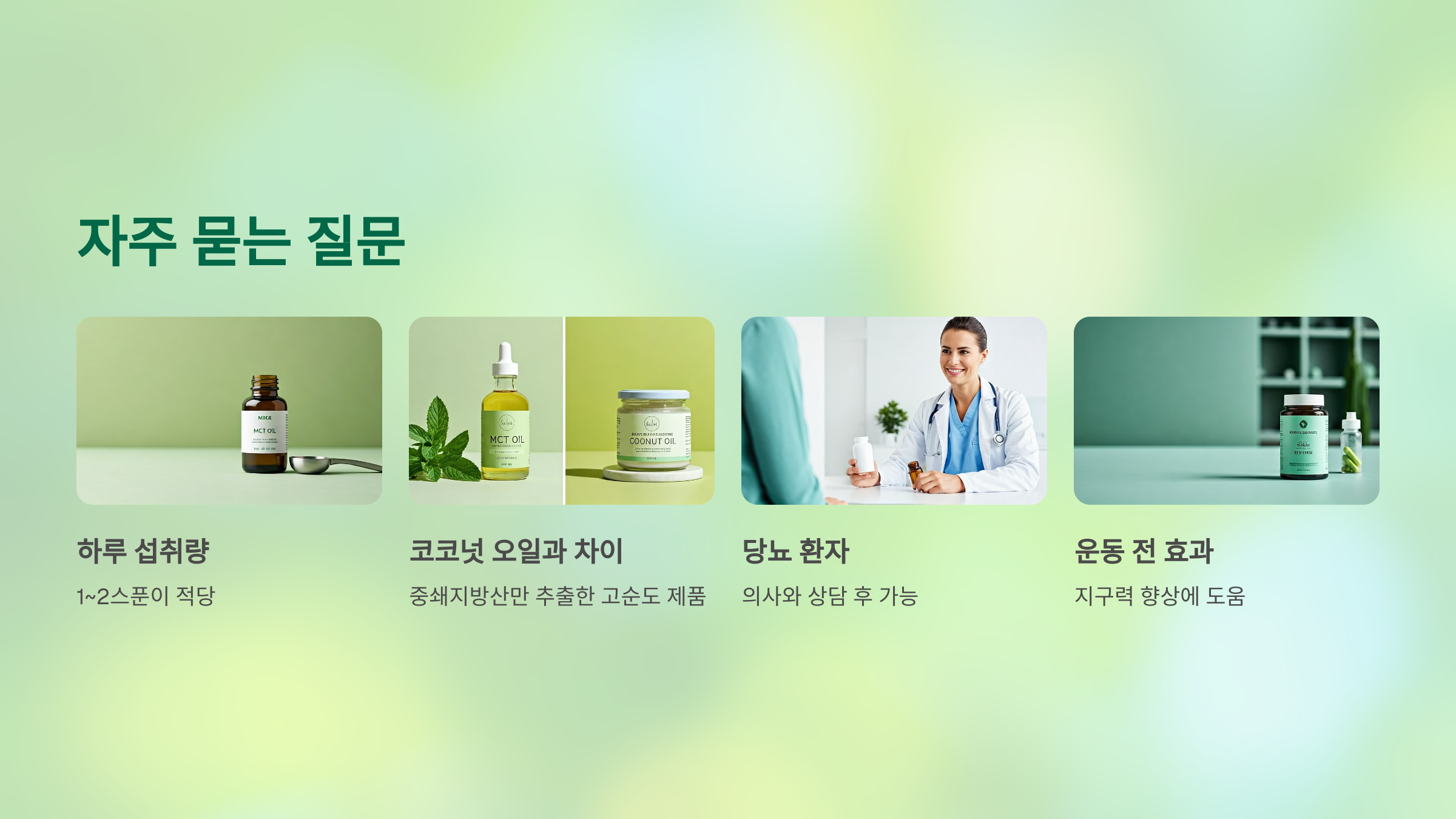 코코넛 오일에는 다양한 지방산이 포함되어 있지만, MCT오일은 중쇄지방산만 추출한 고순도 제품입니다. 효과도 더 집중적이에요.