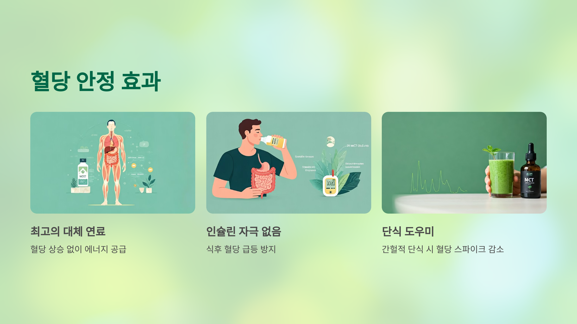 MCT오일은 혈당을 거의 올리지 않으면서도 에너지를 공급해 주는 최고의 대체 연료예요. 인슐린을 자극하지 않고, 식후 혈당 급등 없이 포만감을 유지할 수 있죠. 특히 당질 제한 식단이나 간헐적 단식을 실천할 때 혈당 스파이크를 줄이는 데 큰 도움이 됩니다.