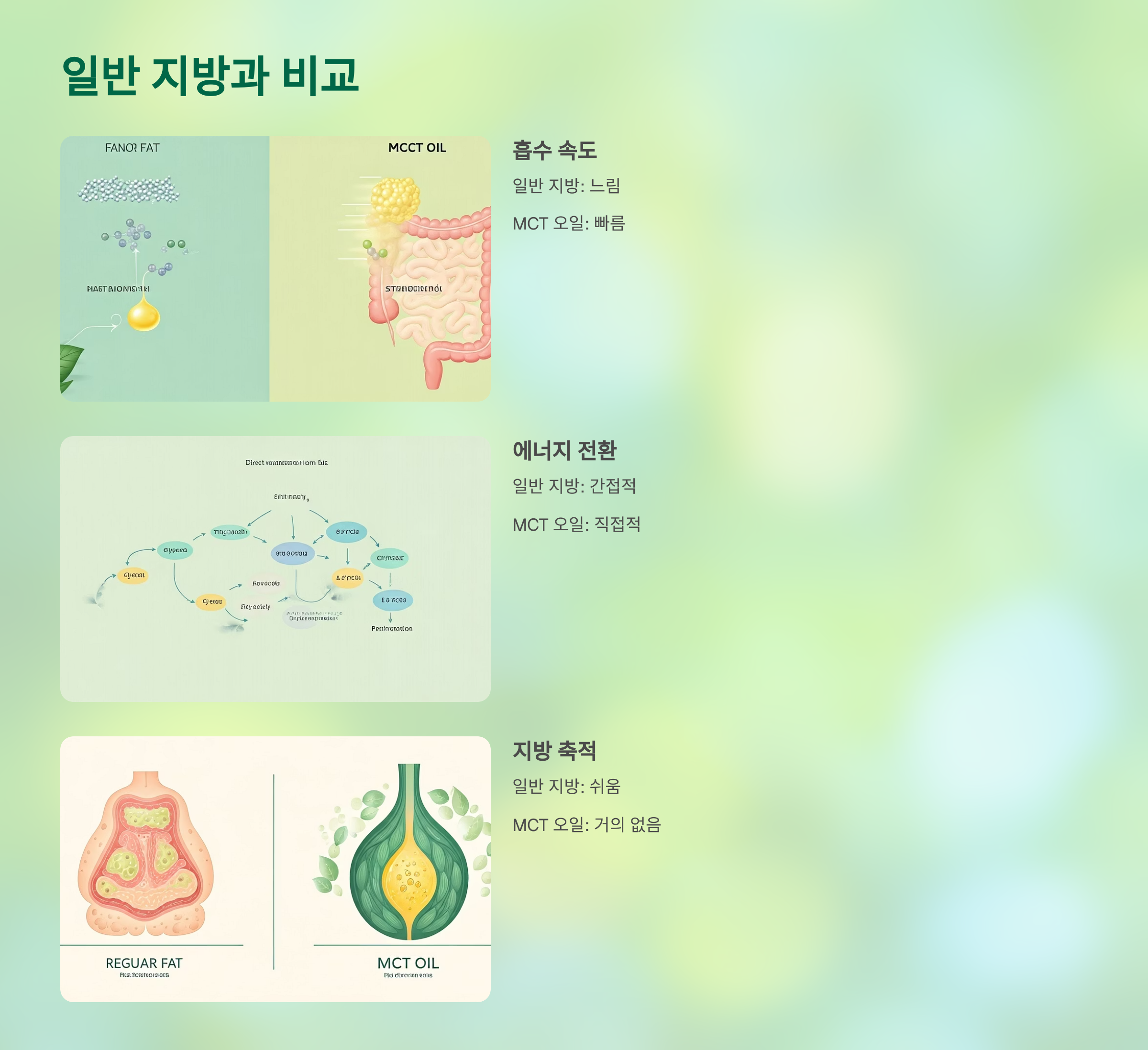 일반적인 식용유, 버터와 비교했을 때 MCT오일은 흡수 속도와 활용도, 다이어트 효과 면에서 압도적인 차이를 보입니다. 아래 표에서 비교해보세요.