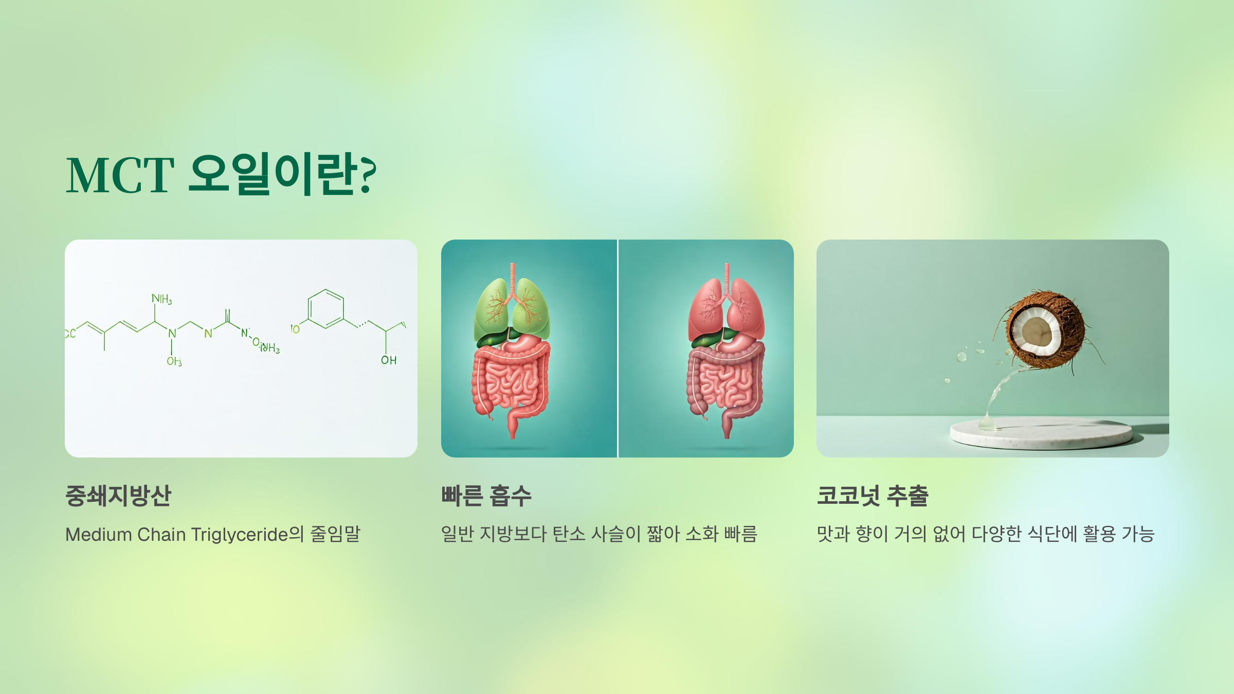 MCT는 Medium Chain Triglyceride의 줄임말로, '중쇄지방산'이라는 의미예요. 일반 지방보다 탄소 사슬이 짧아 소화와 흡수가 매우 빠르고, 간을 통해 바로 에너지로 전환돼요. 대표적으로 C8 (카프릴산), C10 (카프릭산)이 다이어트와 뇌 기능 향상에 효과적인 성분으로 알려져 있어요. MCT오일은 주로 코코넛 오일에서 추출하며, 맛이나 향이 거의 없어 다양한 식단에 쉽게 활용할 수 있답니다.