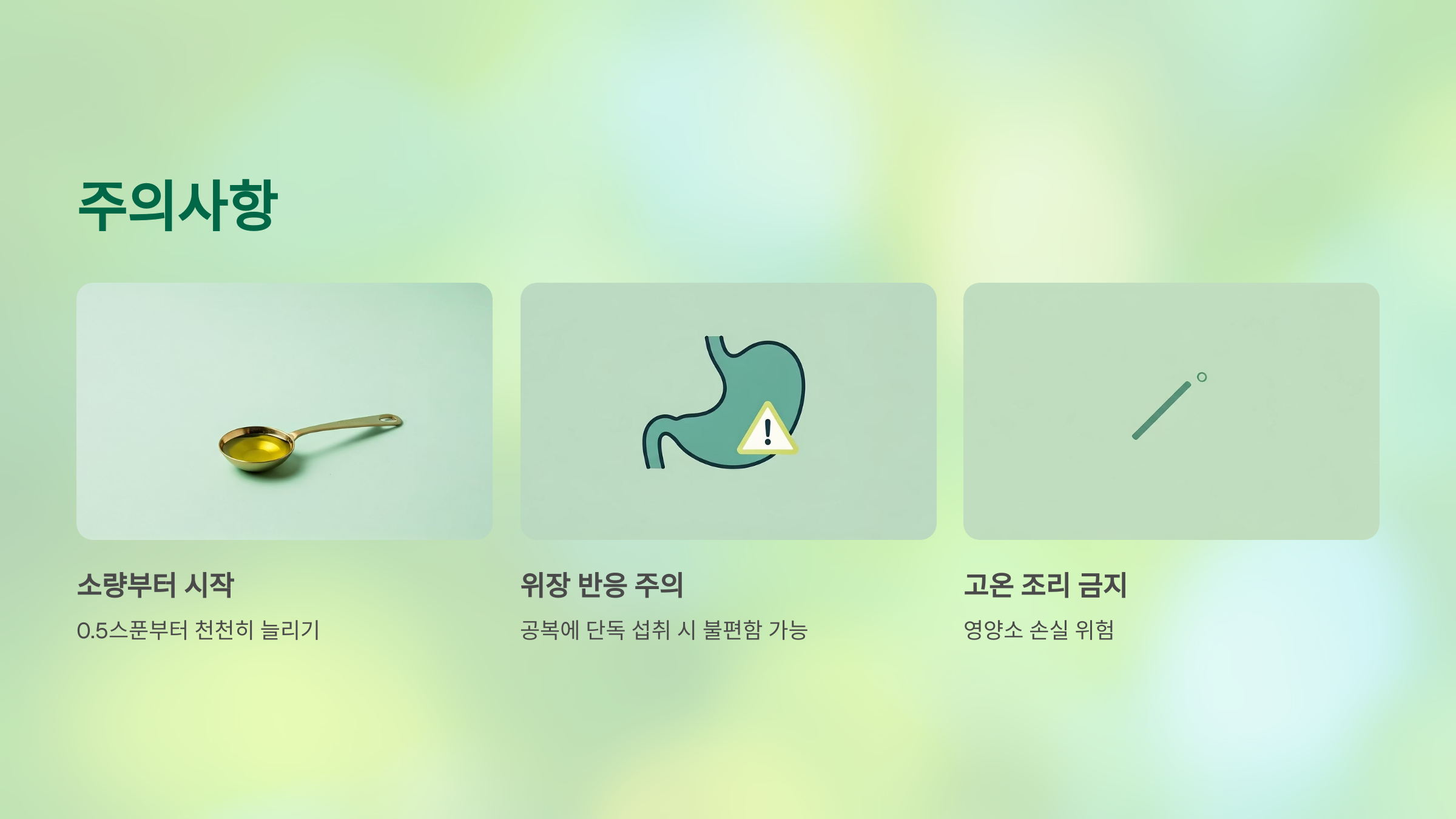 아무리 좋은 오일이라도 잘못 사용하면 효과를 못 보거나 오히려 불편함을 느낄 수 있어요. 아래는 MCT오일을 다이어트에 활용할 때 유의해야 할 점입니다: