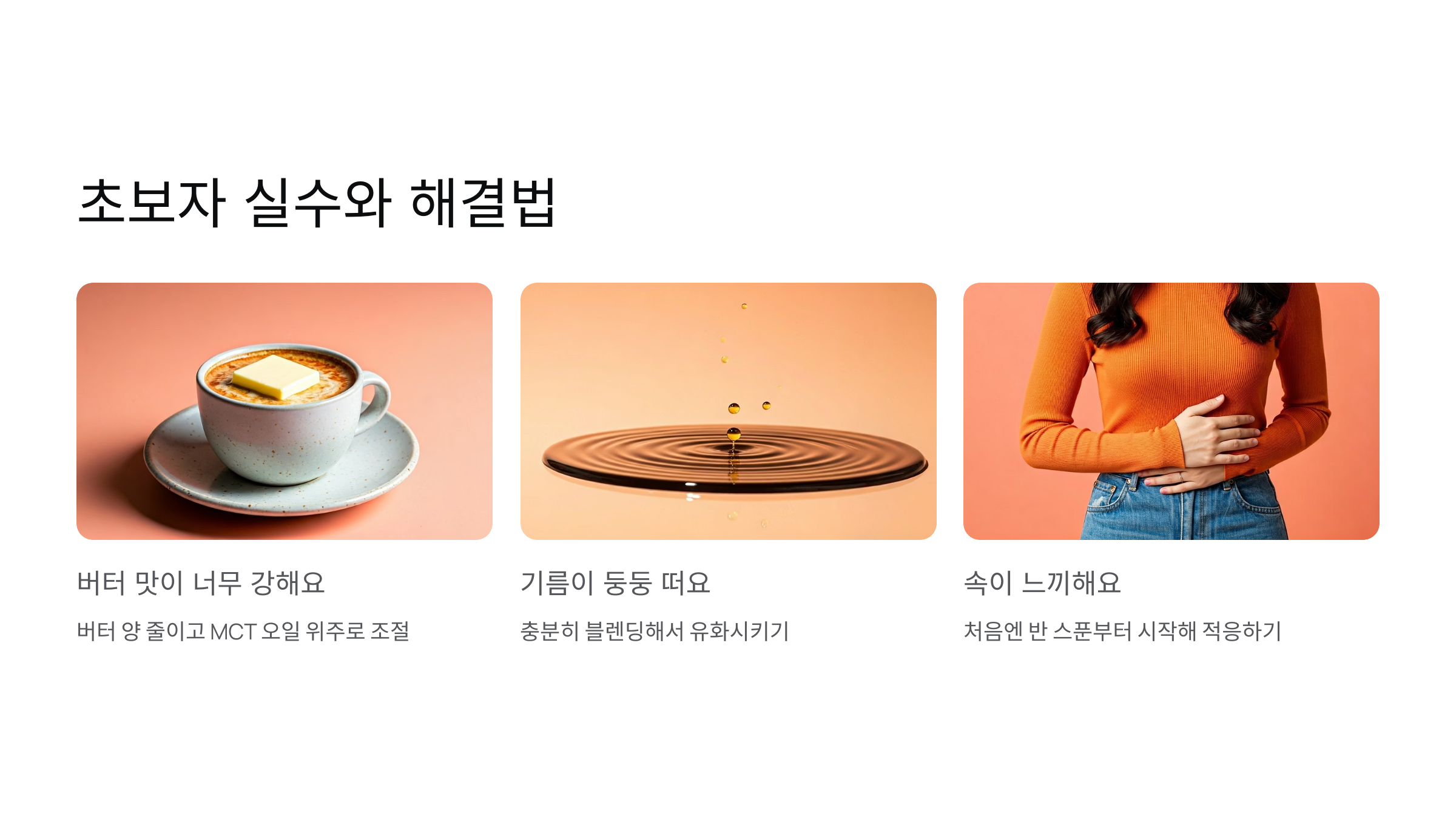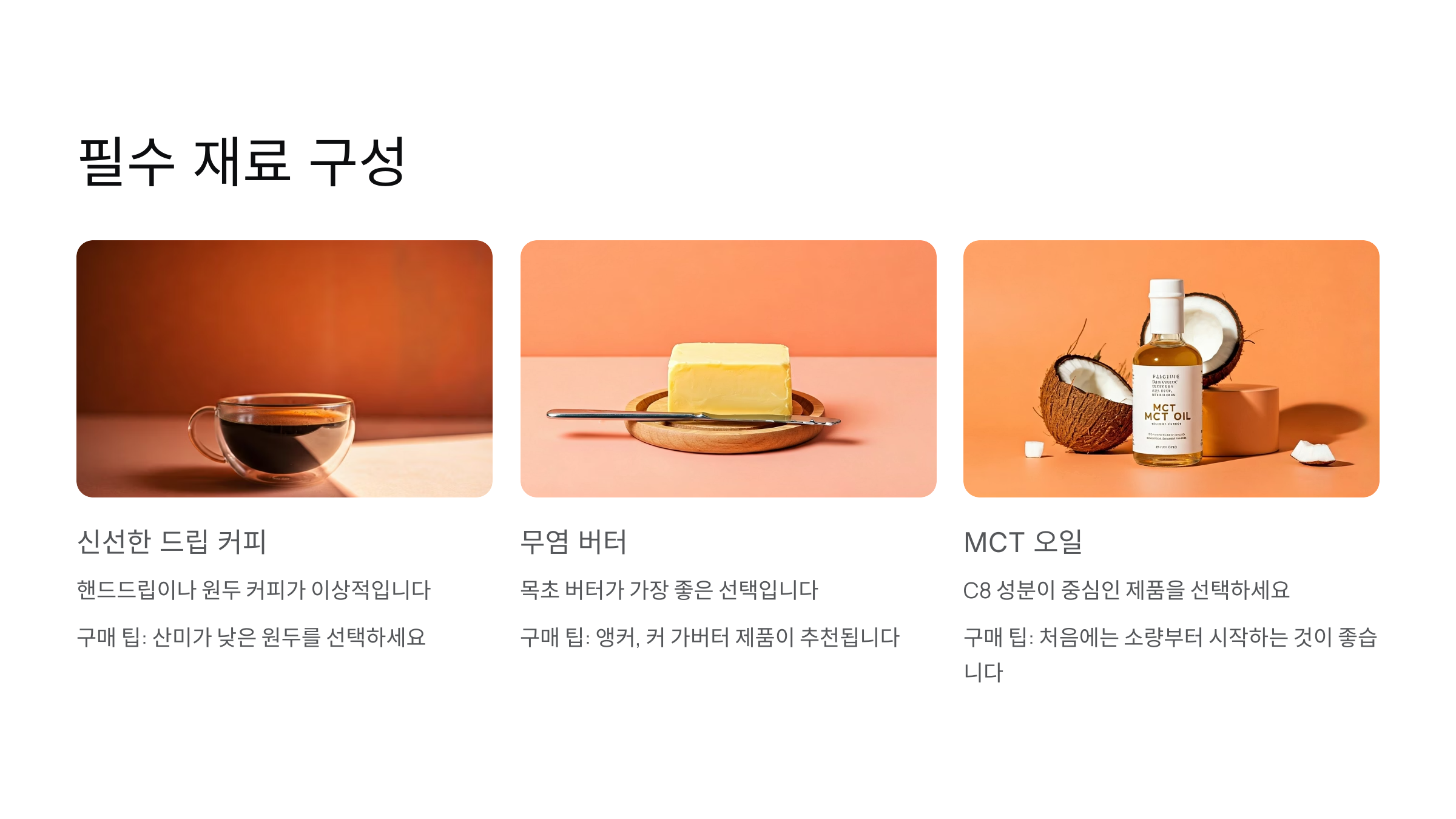 | MCT 오일 | C8 중심의 MCT 오일 | 처음엔 소량부터 시작 |
