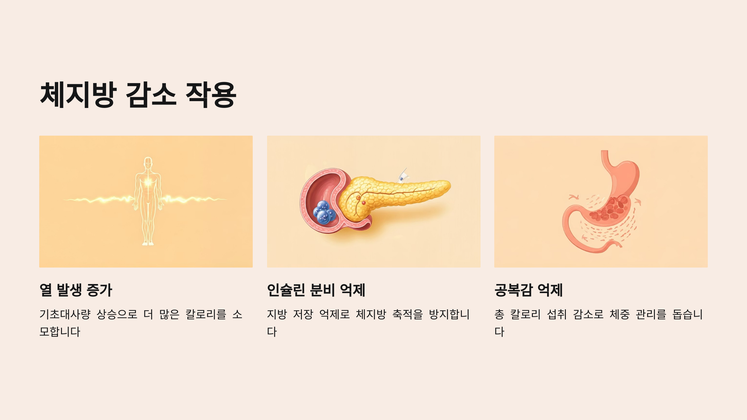 - 열 발생 증가 (Thermogenesis 효과)로 기초대사량 상승