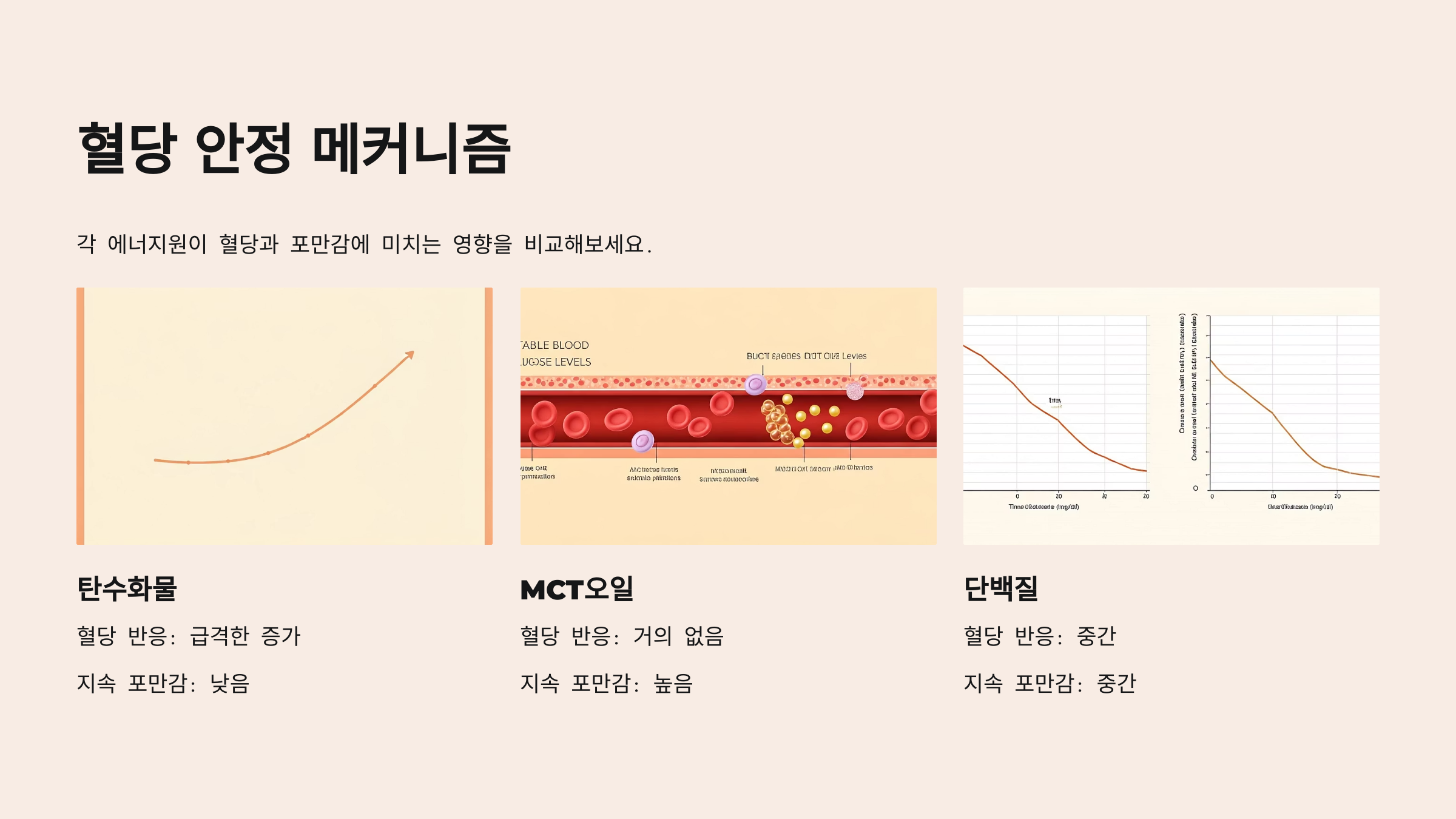 MCT오일은 인슐린 분비를 자극하지 않아서 혈당 스파이크를 일으키지 않아요. 당분 섭취 없이도 포만감을 주고 에너지를 공급할 수 있기 때문에 당뇨 환자나 예비군들에게 탁월한 식단 도구가 됩니다. 다음 표를 통해 혈당 반응 비교를 확인해보세요.