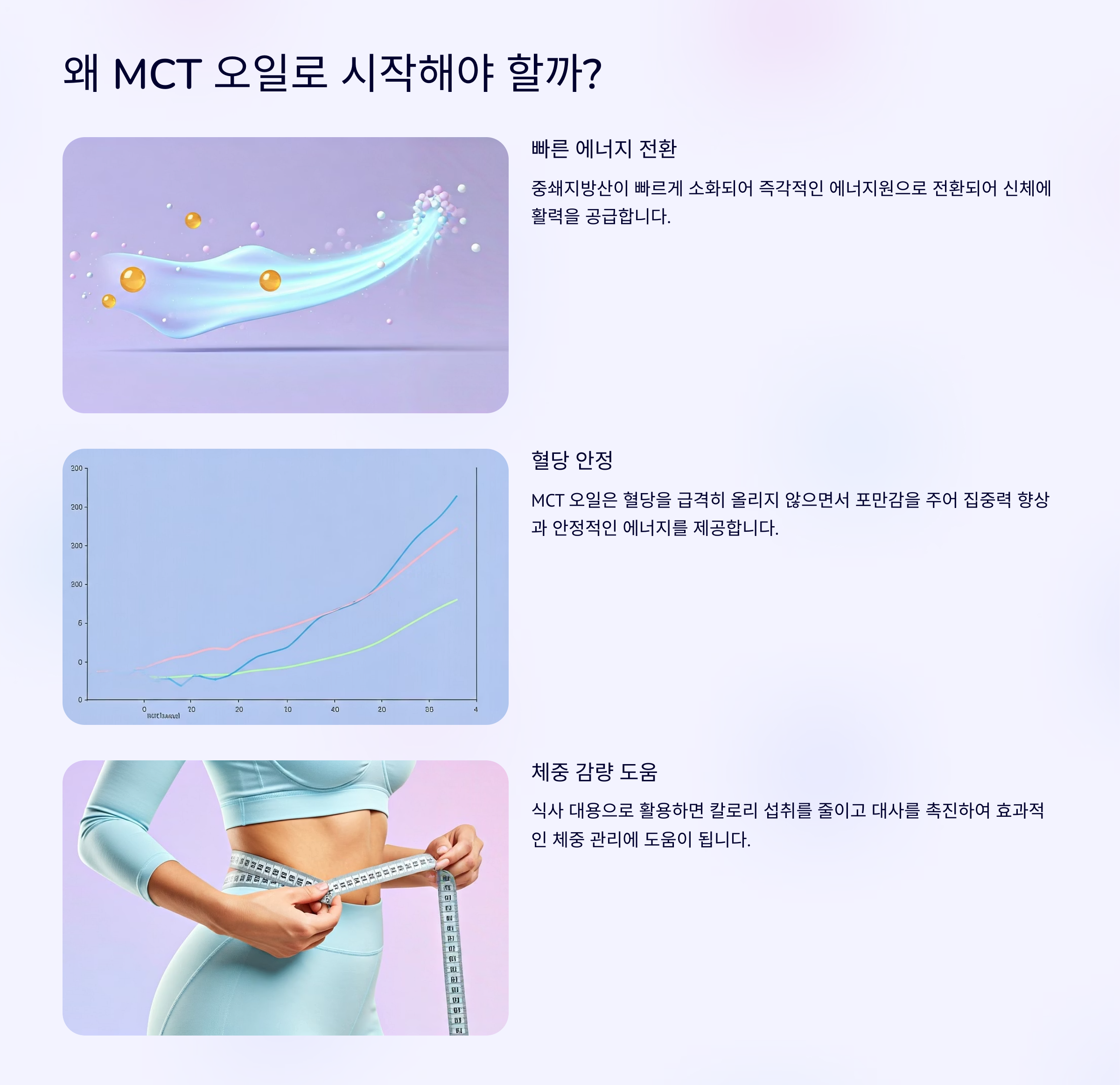 안녕하세요! 저는 불규칙한 식습관과 스트레스로 인해 혈당이 출렁이고, 체중까지 늘어난 상태였어요. 뭔가 바꿔야겠다 싶어 시작한 게 MCT오일이었는데, 효과가 정말 놀라웠어요. 공복 포만감이 생기면서 자연스럽게 식사량이 줄고, 집중력도 좋아졌거든요. 게다가 체중도 점점 빠지더라고요. 오늘은 저 같은 초보자 분들이 MCT오일을 어떻게 시작하면 좋을지, 간단한 레시피와 함께 가이드를 공유하려고 해요. 복잡할 것 같지만 한 번 따라 해보면 생각보다 쉽답니다!