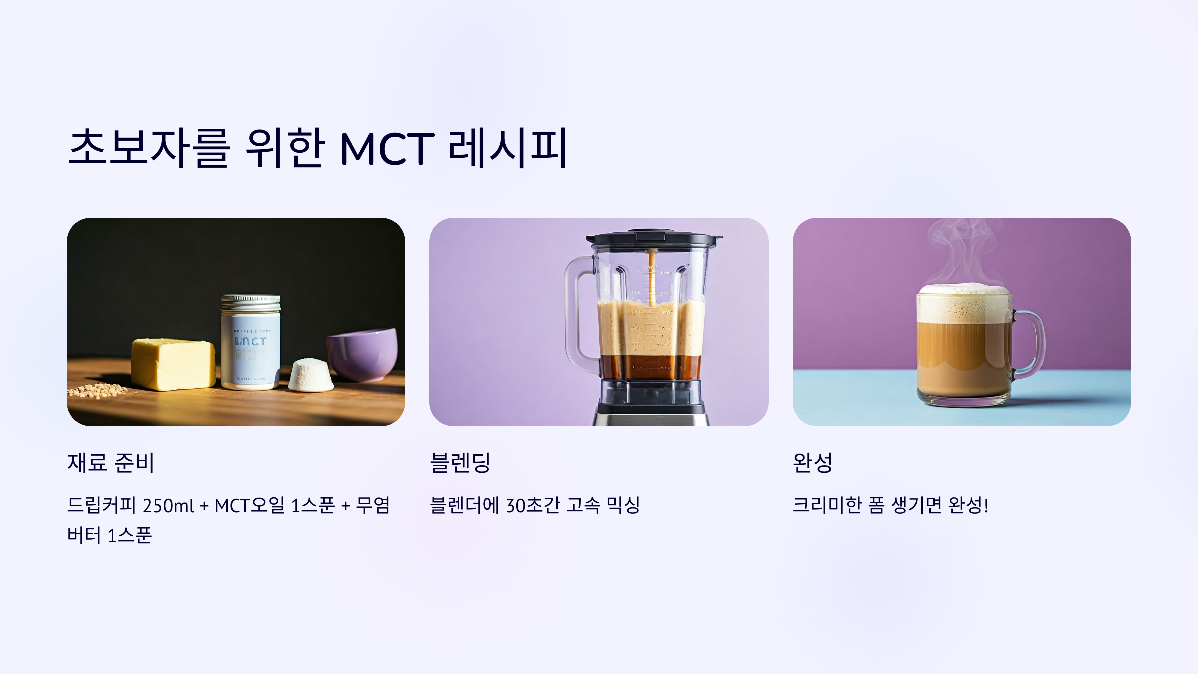 MCT오일을 처음 시작하는 분들을 위한 초간단 레시피입니다. 단 3가지 재료로 아침 루틴을 완성해보세요!