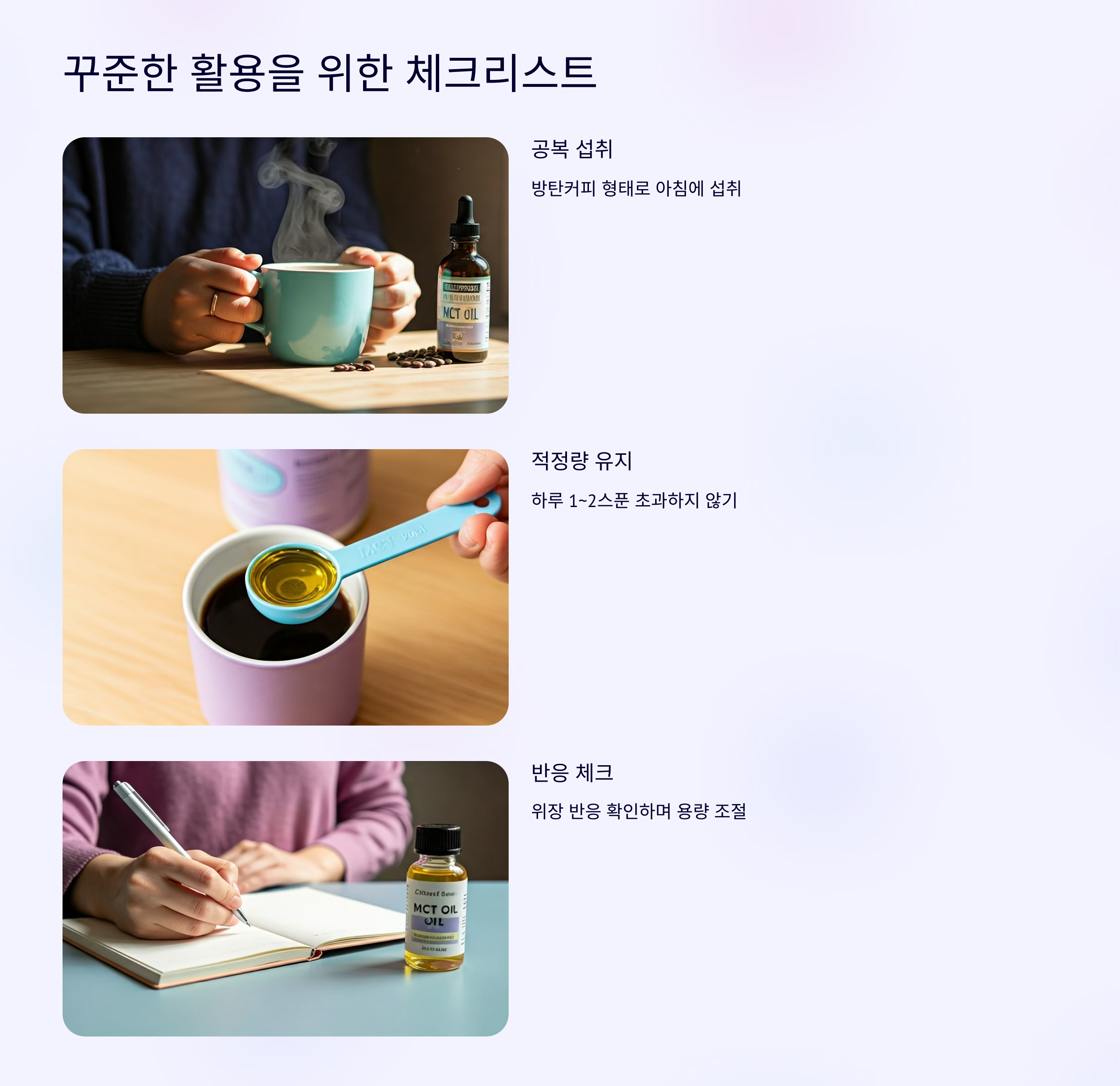 처음엔 낯설고 기름이 무섭게 느껴질 수 있어요. 하지만 MCT오일은 제게 아침의 활력을 주는 작고 확실한 변화였답니다. 포만감도 높아지고, 집중력도 눈에 띄게 좋아졌어요. 무엇보다 혈당의 안정감은 단식 루틴 유지에 정말 큰 도움이 되었죠. 여러분도 한 번만 제대로 시작해보세요. 복잡한 준비 없이, 단 한 잔의 방탄커피 혹은 요거트 한 스푼으로 삶이 달라질 수 있어요. 지금 이 순간, 건강한 선택의 첫걸음을 함께 해볼까요?
