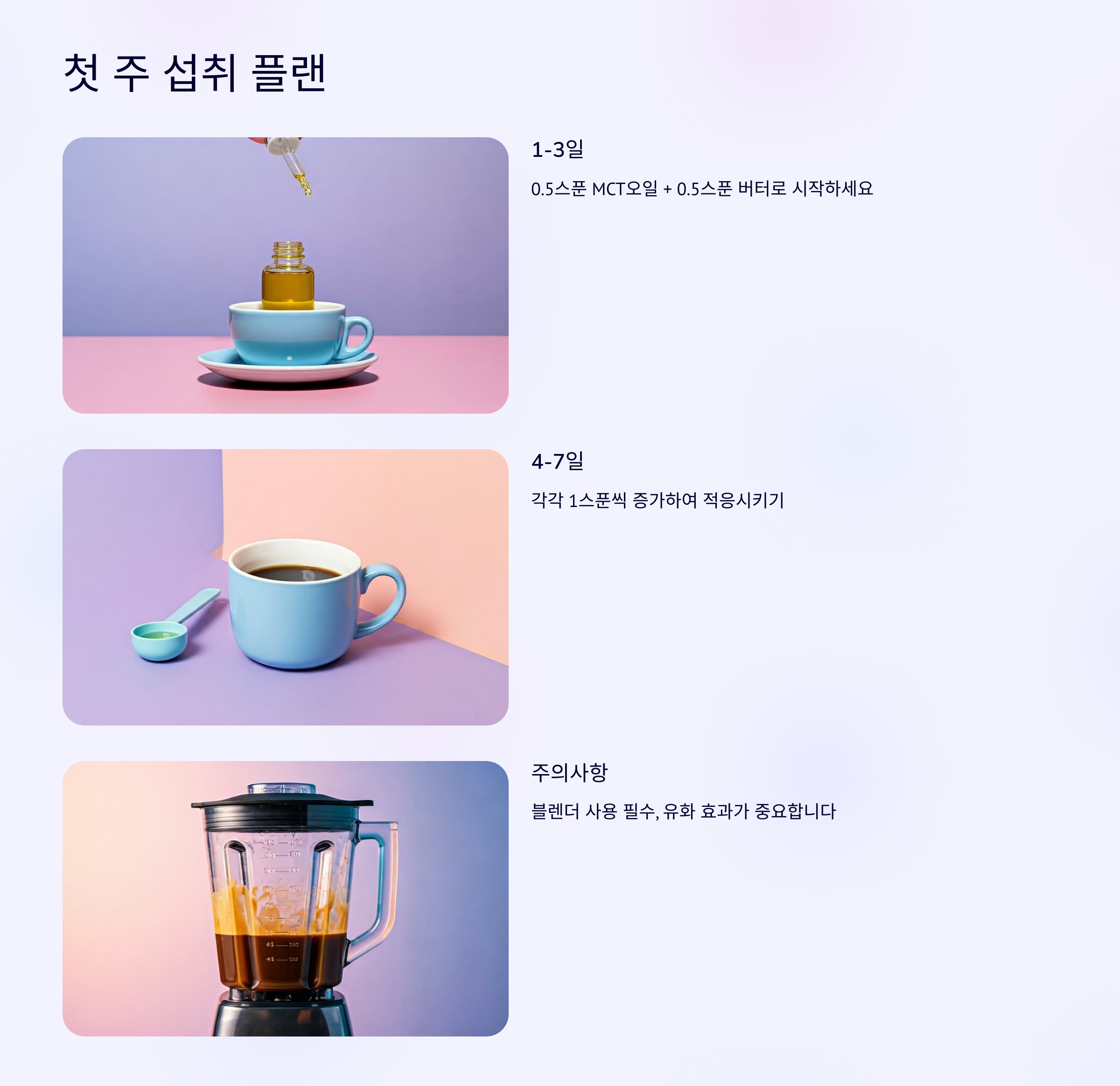 MCT오일은 처음부터 많은 양을 섭취하면 속이 불편할 수 있어요. 아래 플랜을 참고해 천천히 적응해보세요.