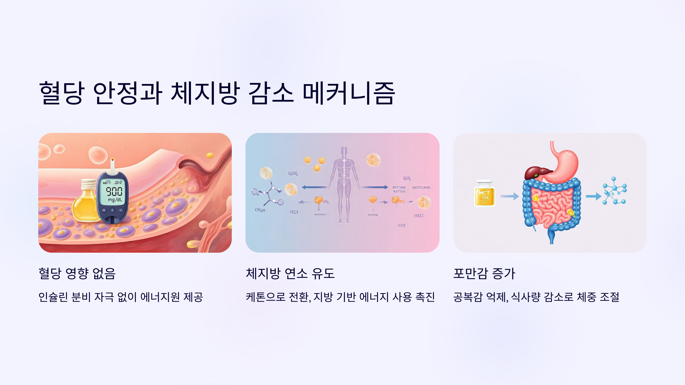 MCT오일이 어떻게 혈당을 안정시키고 체지방을 줄이는지, 아래 표에서 주요 작용 메커니즘을 확인해보세요.
