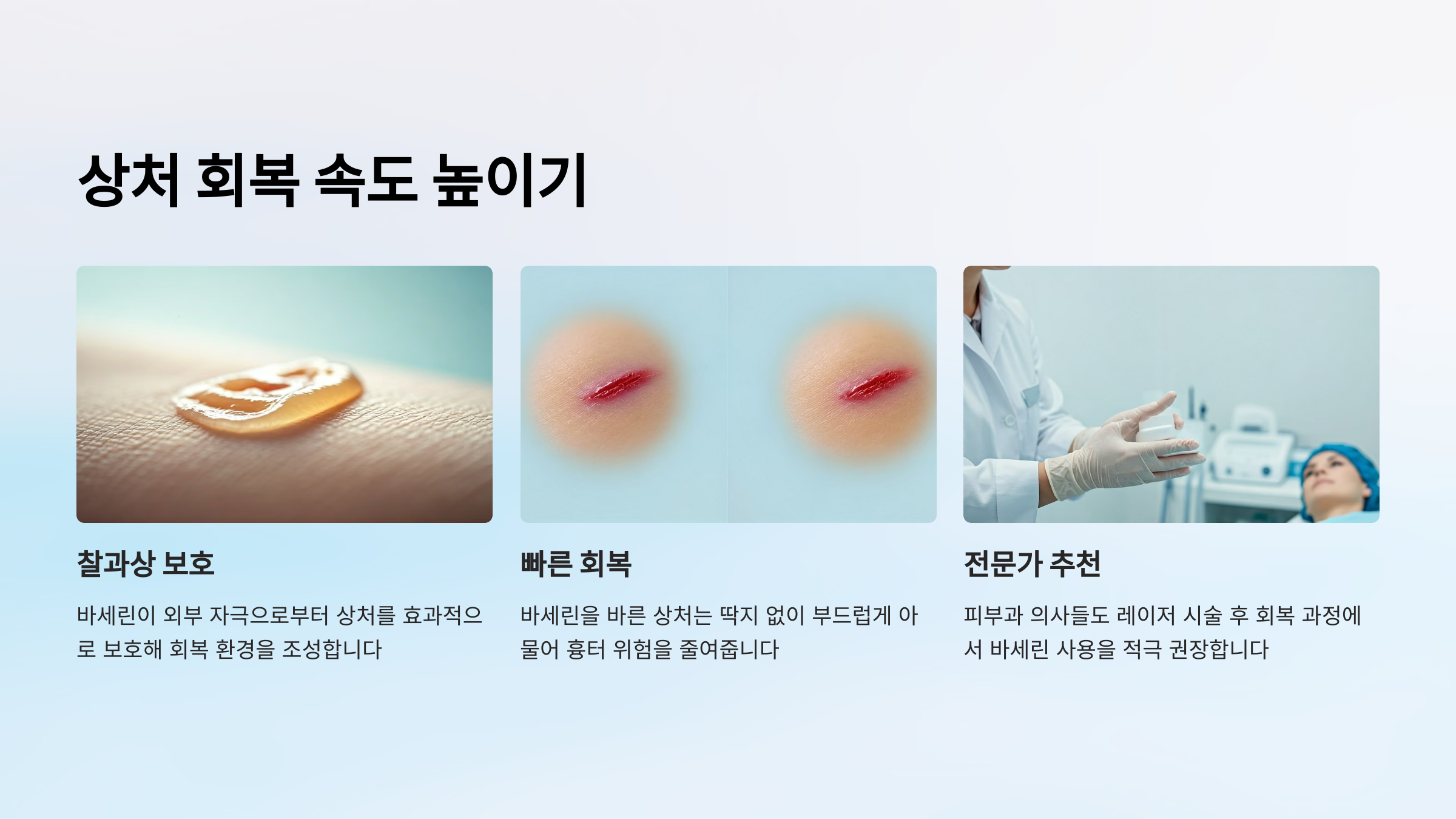 작은 찰과상이나 마른 상처 위에 바세린을 얇게 바르면 외부 자극으로부터 상처를 보호하면서 회복 속도가 빨라져요. 피부과에서도 레이저 시술 후 재생 연고 대신 바세린을 권장하는 경우가 많더라고요. 저도 무릎에 살짝 긁힌 상처에 며칠 발랐는데, 딱지가 생기지 않고 부드럽게 아물었어요!