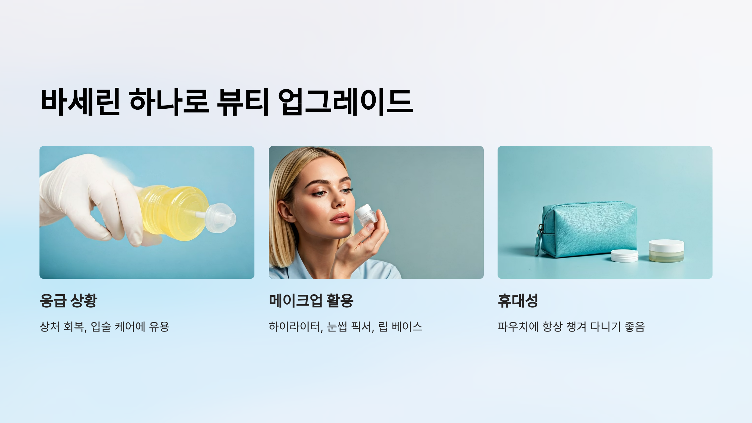 오늘 소개해드린 바세린 5가지 사용법, 어떠셨나요? 한 통으로 이렇게 다양한 뷰티와 건강 관리가 가능하다니 정말 놀랍죠. 특히 상처 회복이나 입술 케어처럼 응급 상황에서도 유용하고, 메이크업 트러블에도 큰 도움이 돼요. 저도 예전엔 그냥 입술 보습용으로만 썼는데, 이제는 파우치에 항상 챙겨 다니게 됐답니다. 여러분도 오늘부터 바세린 하나로 똑똑하게 뷰티 루틴을 업그레이드해보세요. 다음에도 알찬 꿀팁으로 다시 찾아올게요!