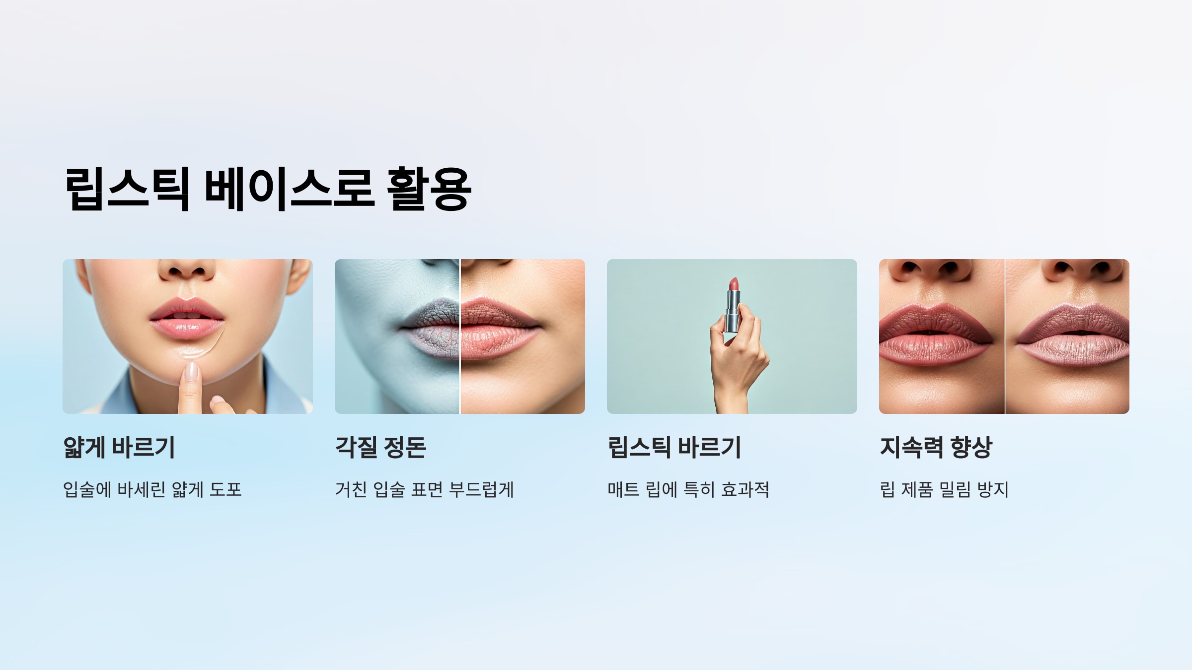 립스틱 바르기 전에 바세린을 얇게 펴발라 두면 각질이 정돈되고 발색이 더 고르게 돼요. 특히 매트 립을 바를 때는 필수! 입술이 건조해서 립 제품이 밀리거나 갈라지는 분들에겐 꼭 추천드리고 싶어요. 저는 촬영 전 꼭 이 방법을 써요. 립이 훨씬 예쁘게 올라가고 지속력도 좋아지더라고요.