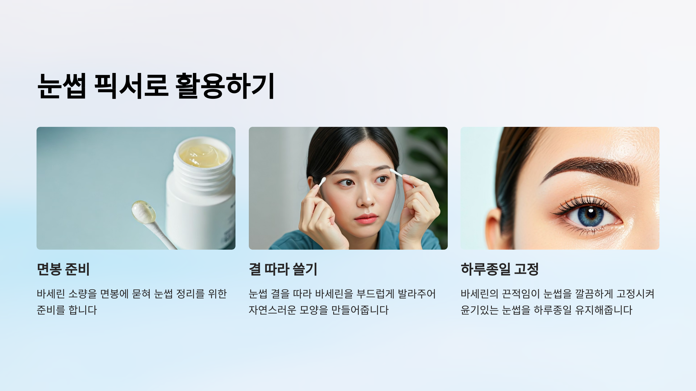 요즘 눈썹 모양을 고정해서 자연스럽게 유지하는 ‘브로우 픽싱’이 대세죠? 바세린을 소량 사용하면 따로 픽서를 쓰지 않아도 눈썹이 하루 종일 고정돼 있어요. 면봉에 바세린을 살짝 묻혀 눈썹 결 방향으로 쓸어주면, 깔끔하고 윤기 있는 눈썹 완성!