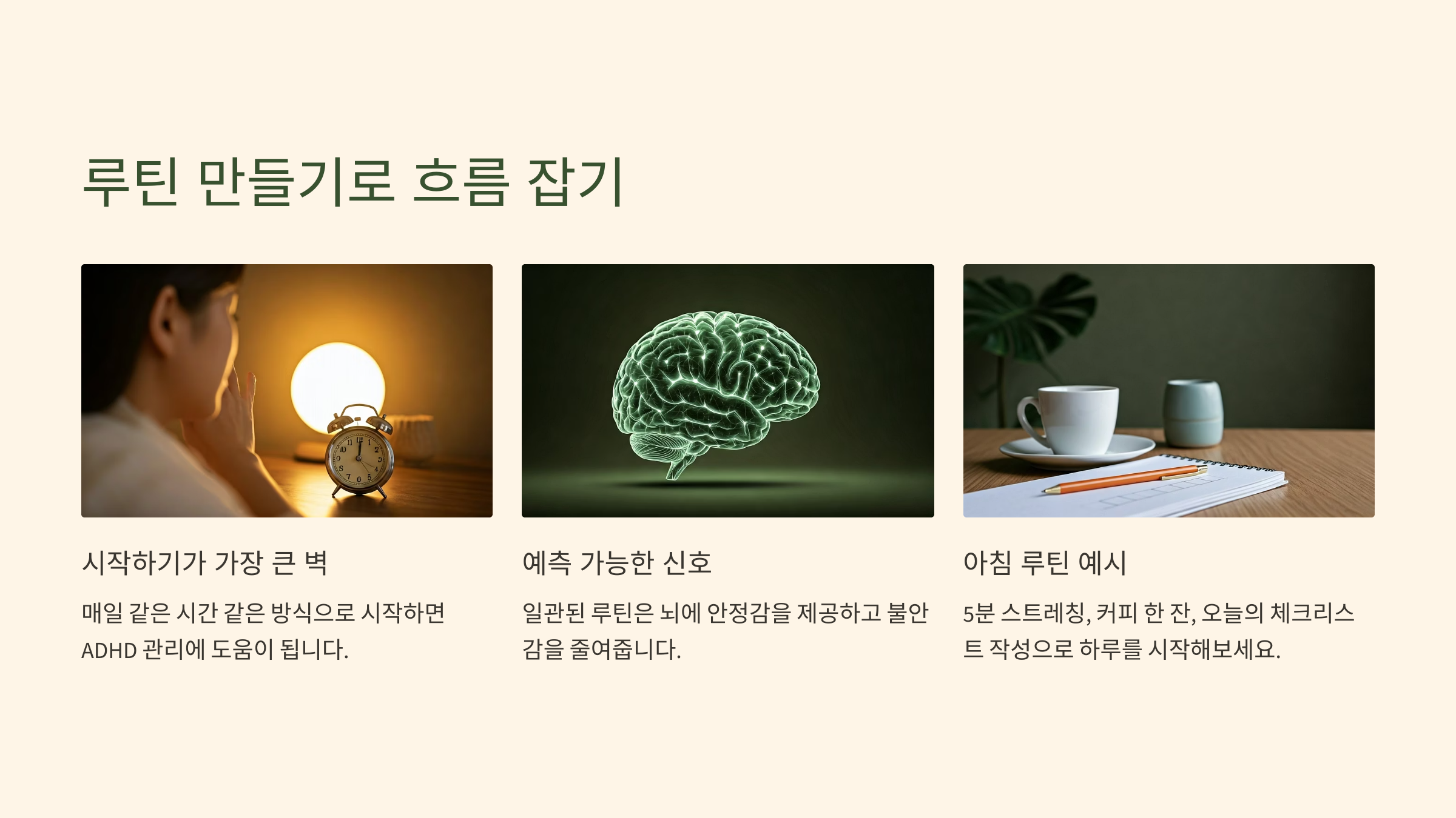 성인 ADHD는 ‘시작하기’가 가장 큰 벽이에요. 매일 같은 시간에 같은 방식으로 하루를 시작하는 루틴은 뇌에 예측 가능한 신호를 주고, 불안을 줄여줍니다. 저는 아침에 일어나자마자 5분 스트레칭, 커피 한 잔, 할 일 체크리스트 작성까지 정해놓고 있어요. 덕분에 하루를 ‘어떻게 시작하지?’라는 고민 없이 시작할 수 있죠.