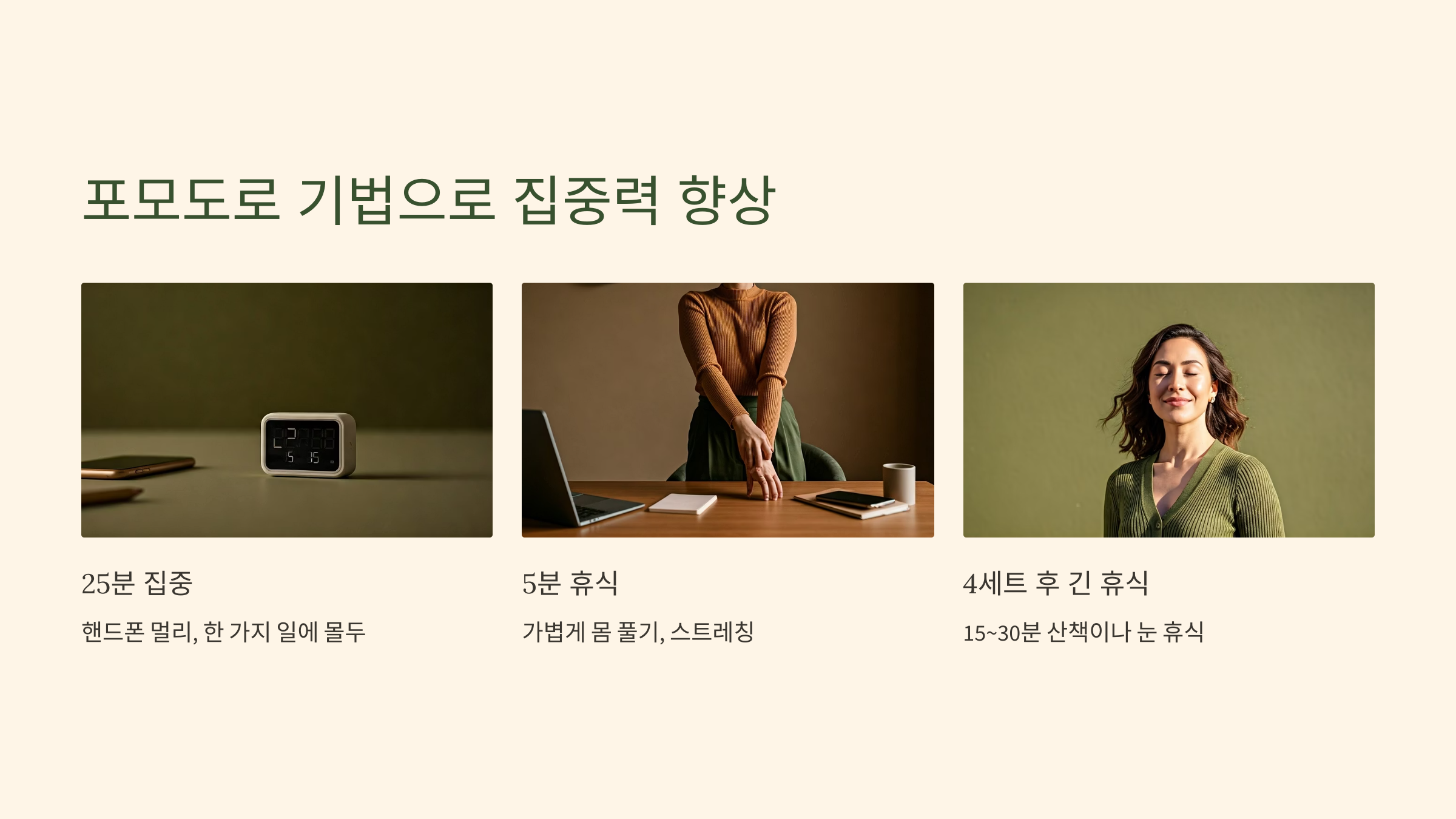 | 25분 집중 | 핸드폰 멀리, 알람 설정 후 오직 한 가지 일에 몰두 |