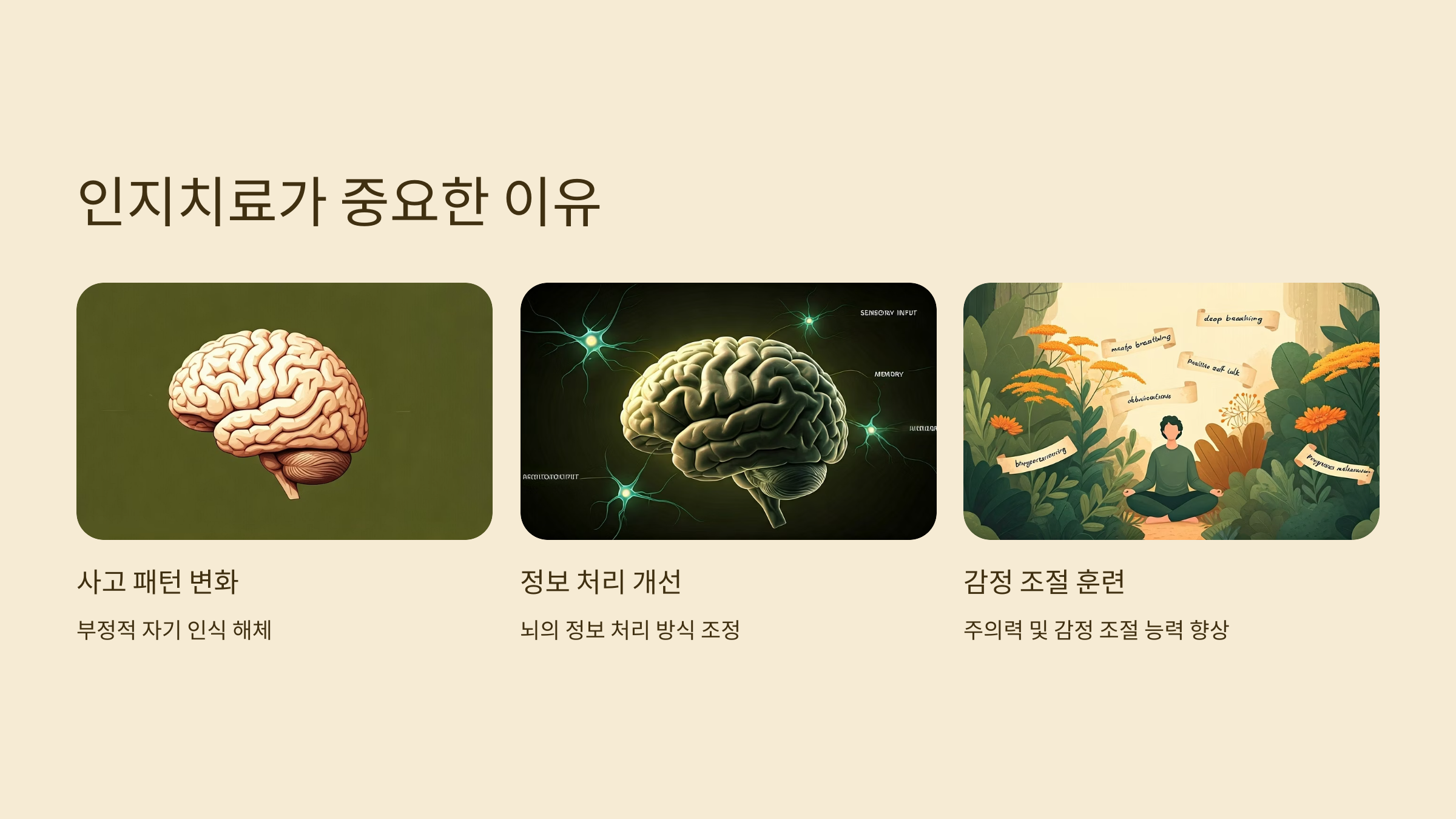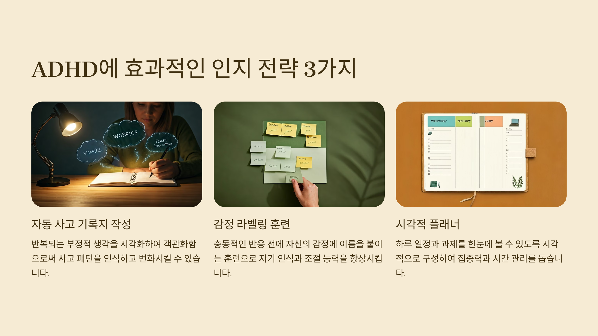 성인 ADHD는 단순한 습관 문제가 아니라 뇌의 정보 처리 방식에 영향을 받아요. 인지치료(CBT)는 이런 사고 패턴을 바꾸고, 주의력 및 감정 조절을 훈련할 수 있게 도와줍니다. 특히 부정적 자기 인식이나 ‘나는 늘 실패한다’는 사고를 해체하는 데 큰 도움이 되었어요.