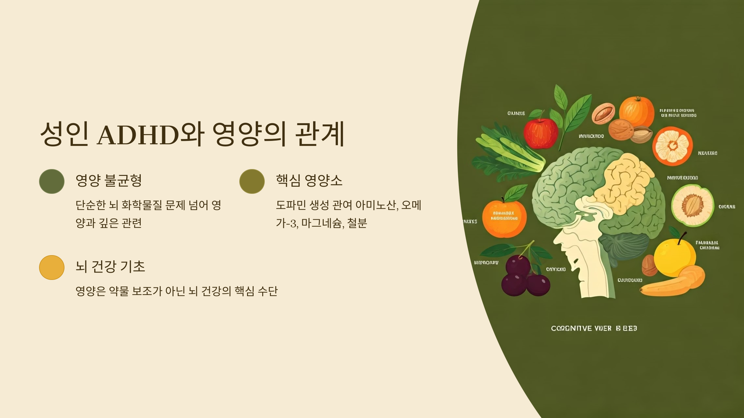 성인 ADHD는 단순한 뇌 화학물질의 문제를 넘어서, 영양 불균형과도 깊은 관련이 있다는 연구가 늘고 있어요. 특히 도파민 생성에 관여하는 아미노산, 오메가-3, 마그네슘, 철분 등이 부족하면 집중력 저하와 충동성 증가에 영향을 미친다고 해요. 영양은 약물의 보조 수단이 아니라, 뇌 건강의 근본을 다지는 핵심 수단이에요.