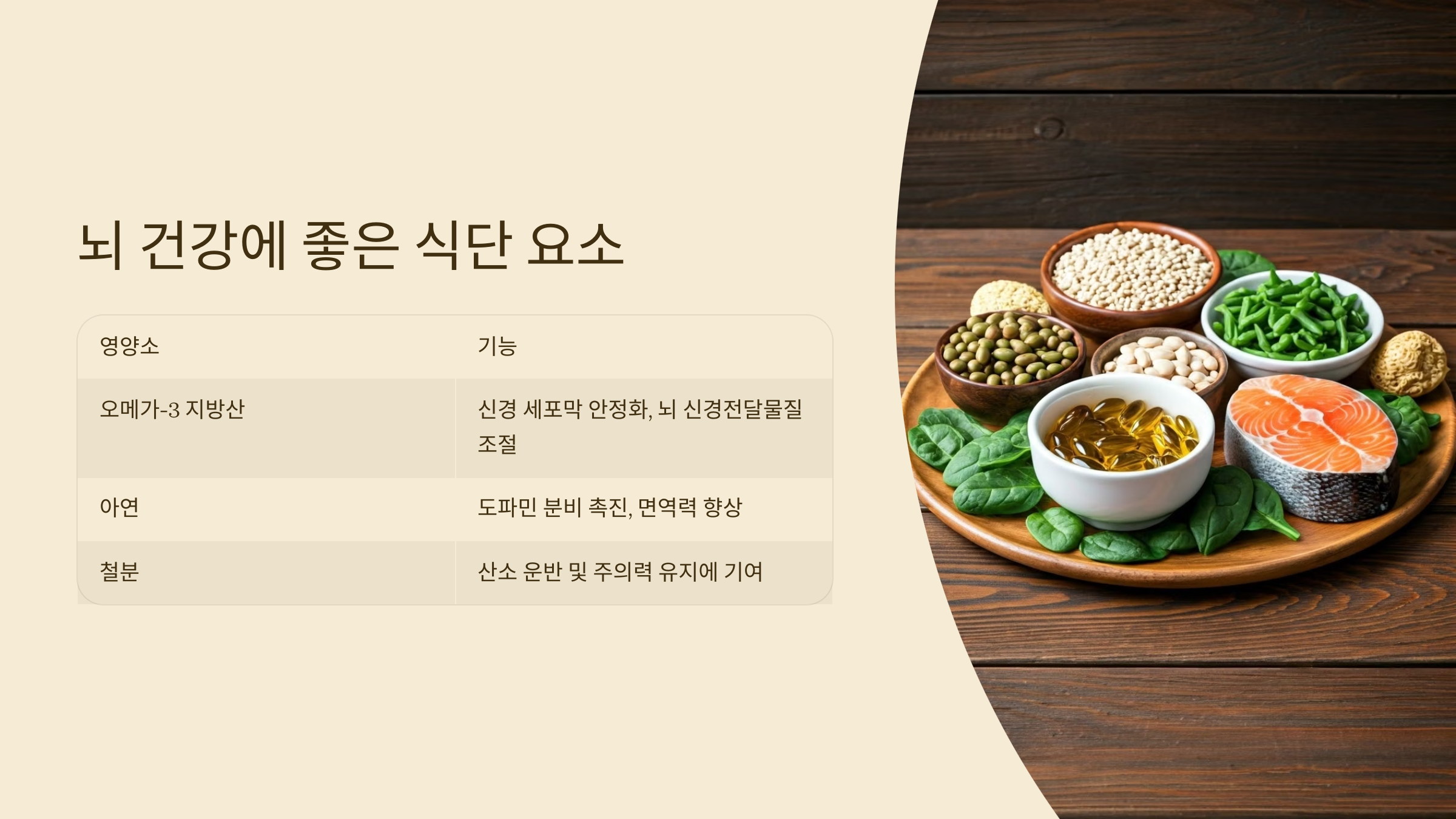 | 오메가-3 지방산 | 신경 세포막 안정화, 뇌 신경전달물질 조절 |