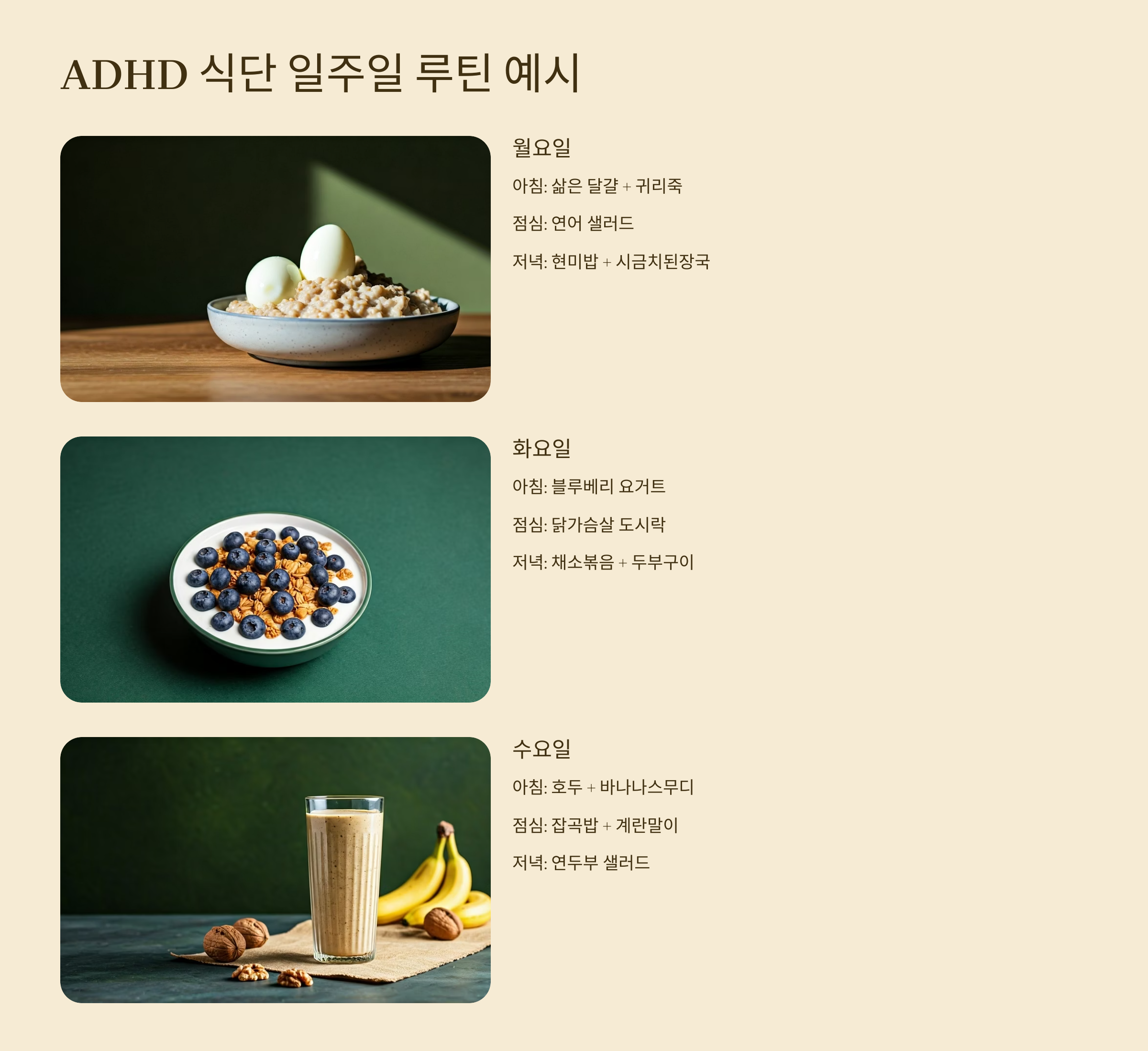 꾸준한 식단은 뇌 기능 유지에 큰 도움이 됩니다. 아래는 제가 실천하고 있는 ADHD 식단 루틴 예시예요.