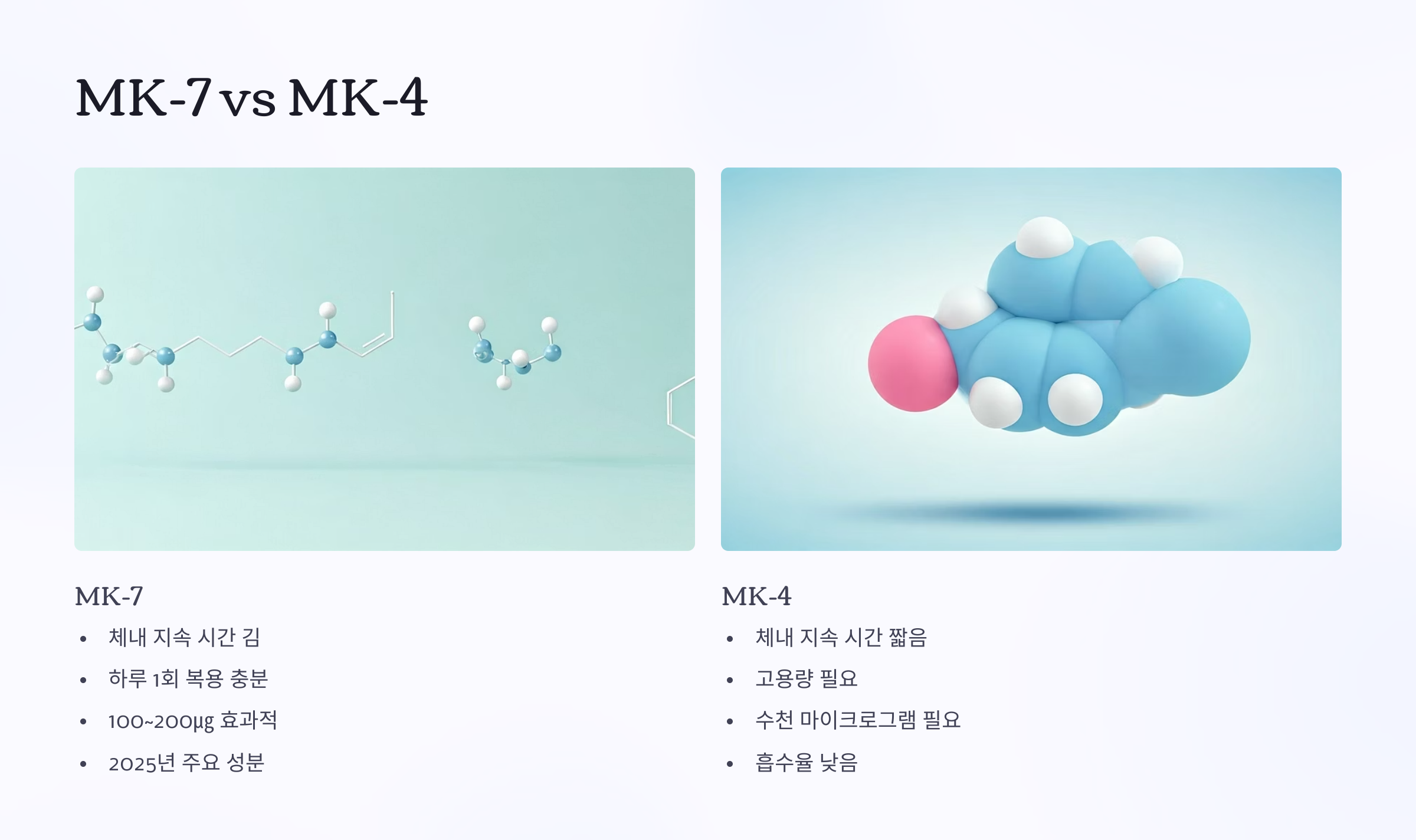 비타민 K2는 MK-4, MK-7로 나뉘는데, MK-7은 체내 지속 시간이 길어 하루 1회 복용으로 충분하며, 뼈 및 혈관 건강 모두에 탁월한 효과를 보입니다. MK-4는 고용량이 필요하며 흡수율이 낮은 편이에요. 2025년 현재 대부분의 보충제는 MK-7을 주성분으로 채택하고 있습니다.
