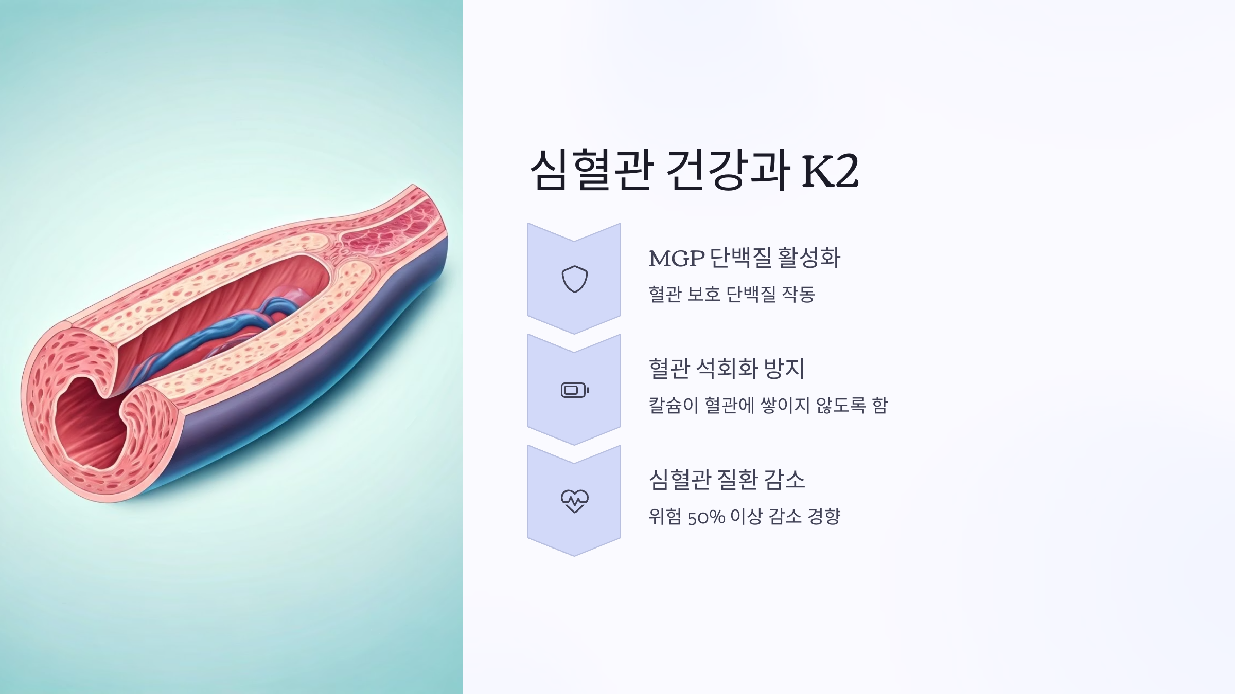 칼슘이 혈관벽에 축적되면 동맥경화와 심장병 위험이 커져요. K2는 ‘매트릭스 Gla 단백질(MGP)’을 활성화시켜 혈관에 칼슘이 쌓이지 않도록 막아줍니다. 실제 연구에서도 K2 섭취량이 많은 그룹에서 심혈관 질환 위험이 50% 이상 감소하는 경향을 보였어요.