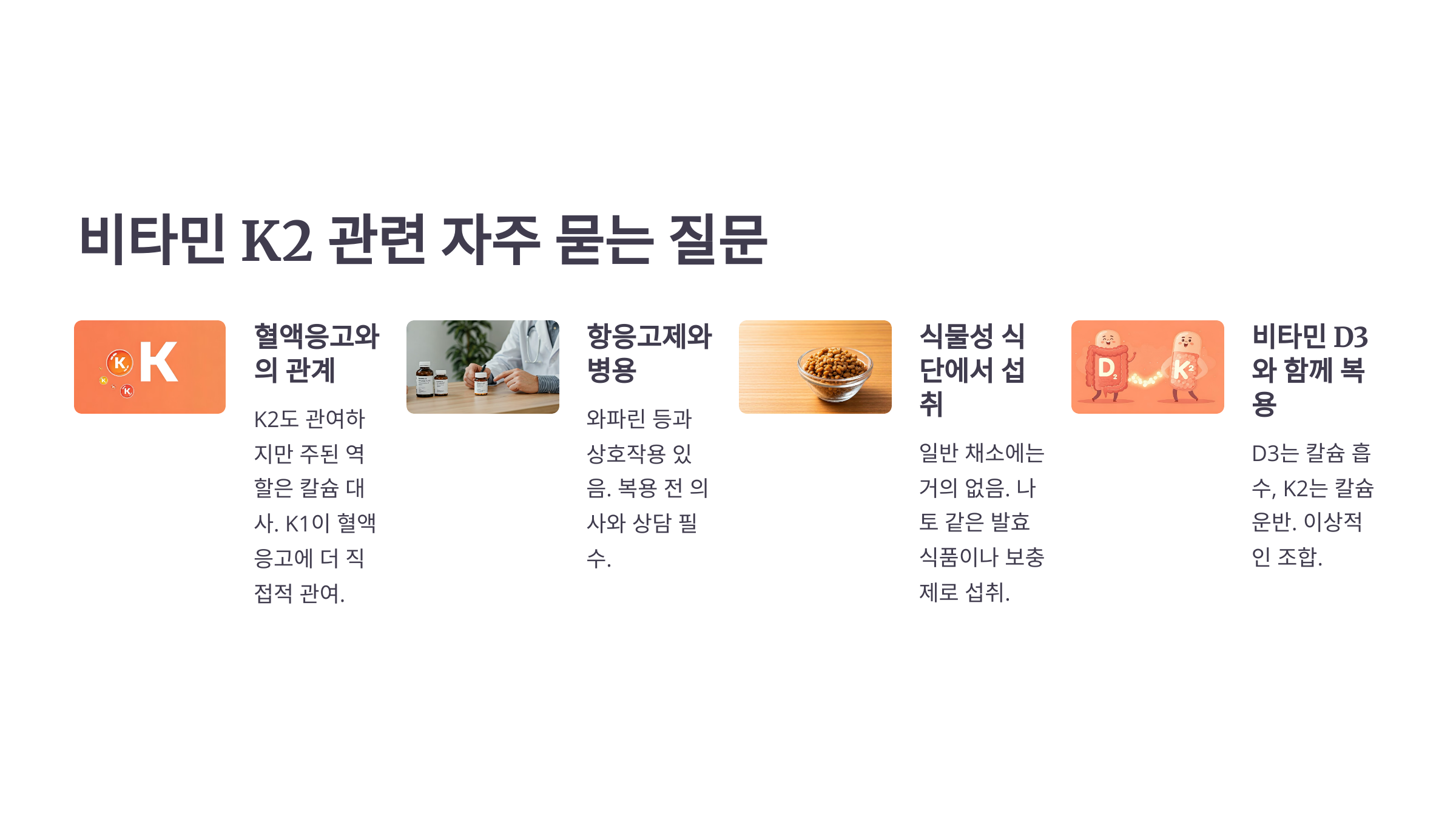 주의가 필요해요. 와파린 등의 항응고제와 K2는 상호작용이 있으므로 복용 전 반드시 의사와 상담하세요.