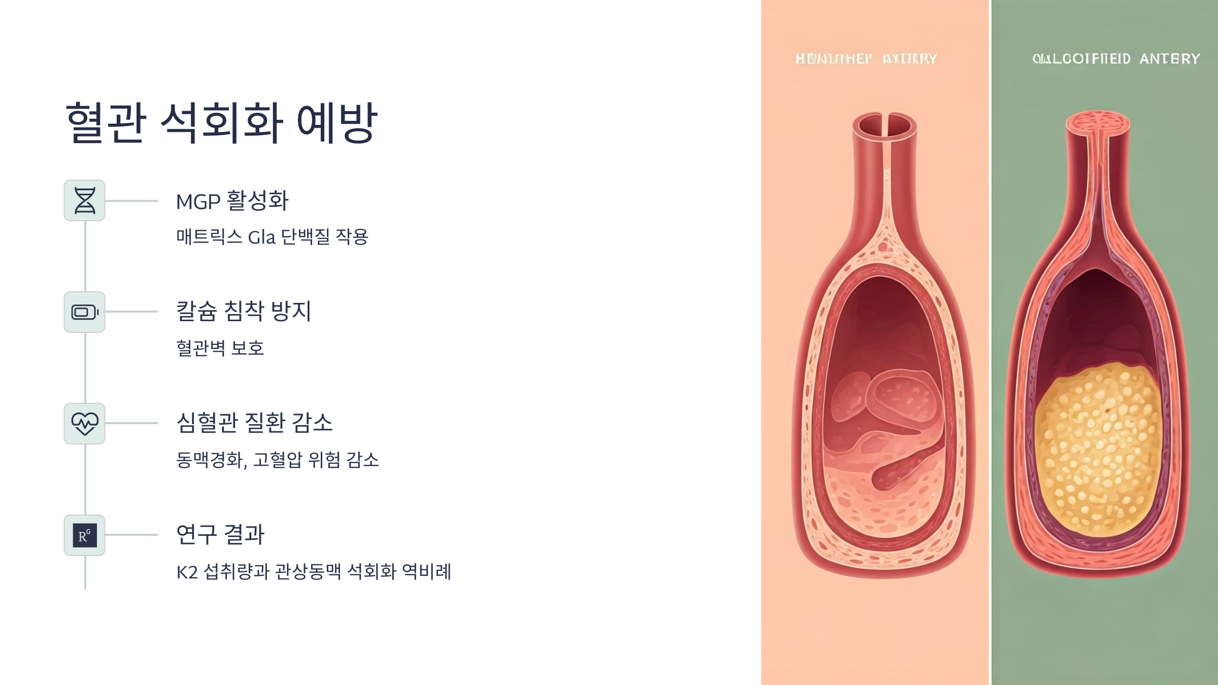 비타민 K2는 ‘매트릭스 Gla 단백질(MGP)’을 활성화시켜 칼슘이 혈관 벽에 침착되는 것을 방지합니다. 이로 인해 동맥경화, 심장병, 고혈압 등의 심혈관 질환 위험을 줄일 수 있어요. 실제로 K2 섭취가 많은 사람일수록 관상동맥 석회화가 적다는 연구 결과도 다수 발표되었죠.