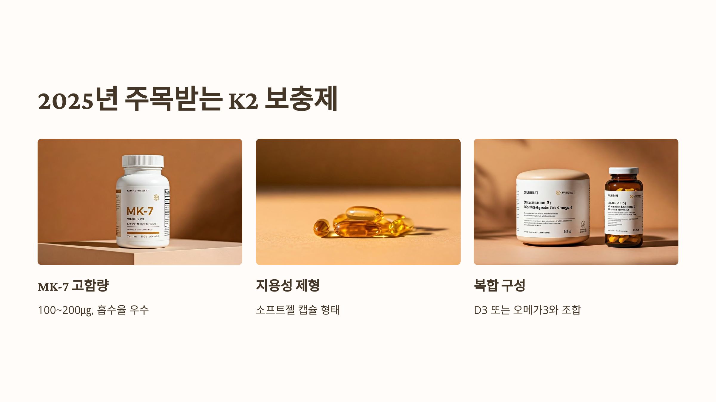 2025년 현재 가장 인기 있는 K2 보충제는 MK-7 타입의 천연 발효형으로, 흡수율과 지속 시간이 우수하다는 평가를 받고 있어요. 특히 K2 + D3 복합제, K2 + 오메가3 조합 제품은 뼈와 면역을 동시에 케어할 수 있어 많은 소비자들에게 각광받고 있습니다.
