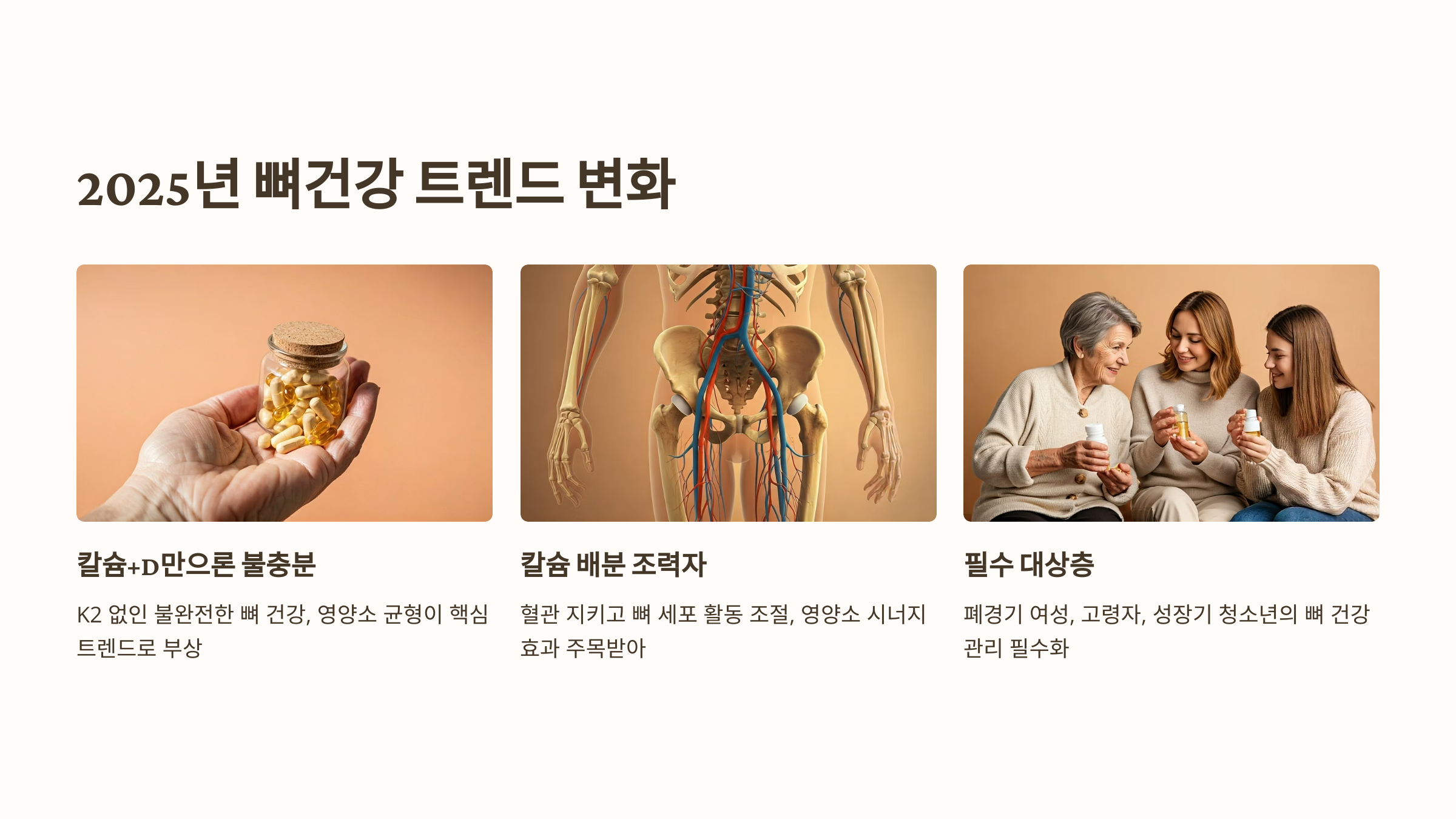예전엔 칼슘과 비타민 D만 챙기면 뼈 건강은 끝이라는 인식이 많았지만, 2025년 현재는 ‘K2 없인 불완전하다’는 인식이 대세예요. K2는 칼슘을 올바르게 배분하고, 혈관을 지키며, 뼈 세포의 활동을 조절하는 조력자 역할을 하거든요. 특히 폐경기 여성, 고령자, 성장기 청소년에게 필수 트렌드 성분으로 떠오르고 있어요.