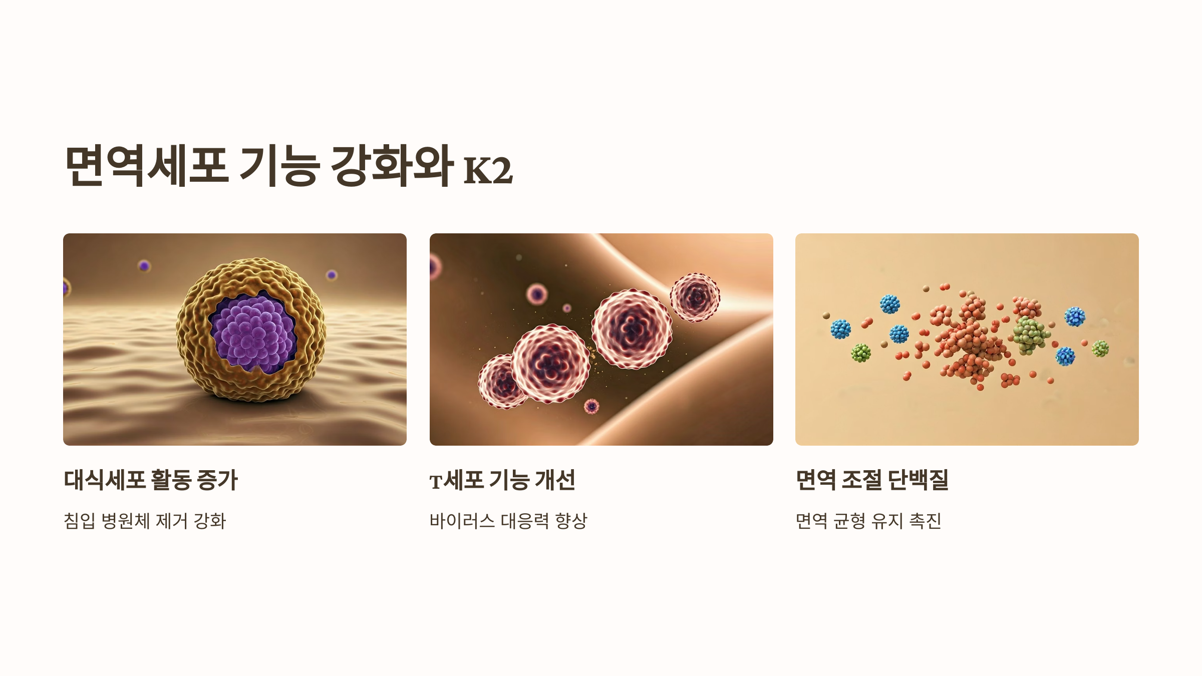 많은 분들이 뼈 건강과 면역력을 별개로 생각하지만, 실제로 골수는 면역세포가 생성되는 핵심 기관입니다. 건강한 골밀도와 균형 잡힌 칼슘 대사는 면역세포의 생성과 기능에도 직접적으로 영향을 줍니다. 비타민 K2는 뼈 세포와 면역세포의 ‘접점’을 지키는 역할을 하며, 면역력 유지에 있어 뼈 건강이 매우 중요하다는 점을 강조합니다.
