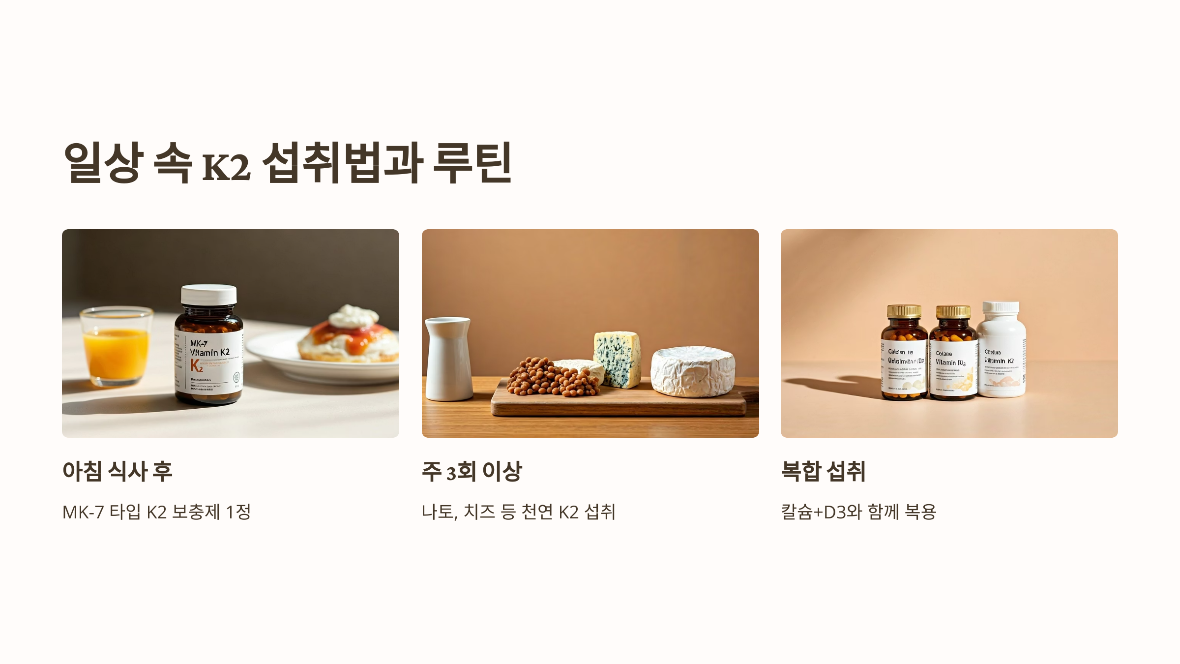 - 주 3회 이상 나토 또는 치즈 섭취 (K2 천연 공급원)