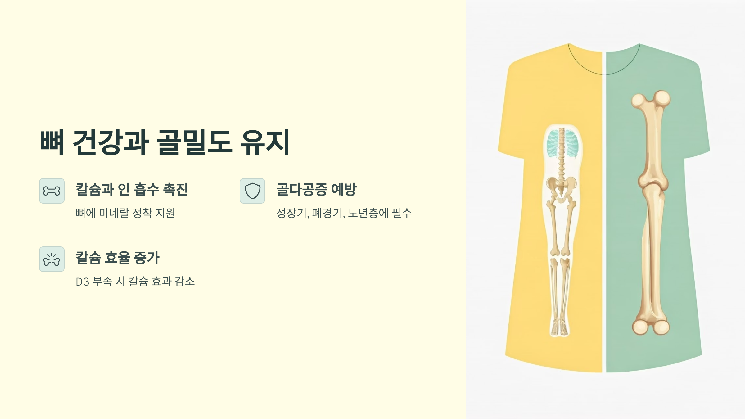 비타민 D3는 칼슘과 인의 흡수를 돕고, 이들이 뼈에 잘 정착할 수 있도록 지원해요. D3가 부족하면 아무리 칼슘을 섭취해도 효과가 떨어지죠. 특히 성장기 청소년과 폐경기 여성, 노년층은 골다공증 예방을 위해 반드시 D3를 충분히 보충해야 합니다.