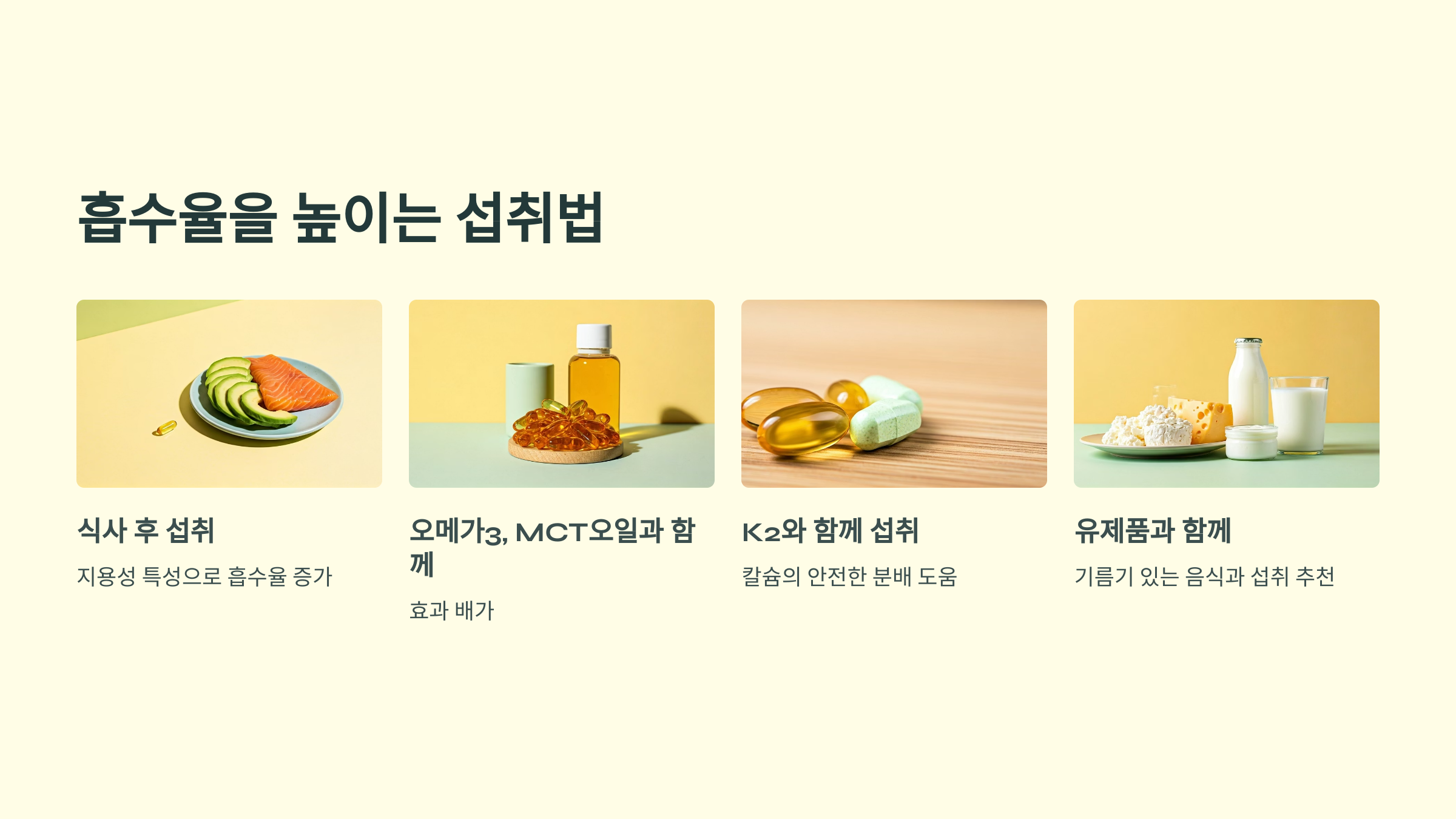 흡수율을 높이기 위해선 단순히 복용 시간보다, 어떤 음식과 함께 먹느냐가 더 중요해요. 기름기 있는 음식이나 유제품과 함께 섭취하는 것이 추천됩니다.