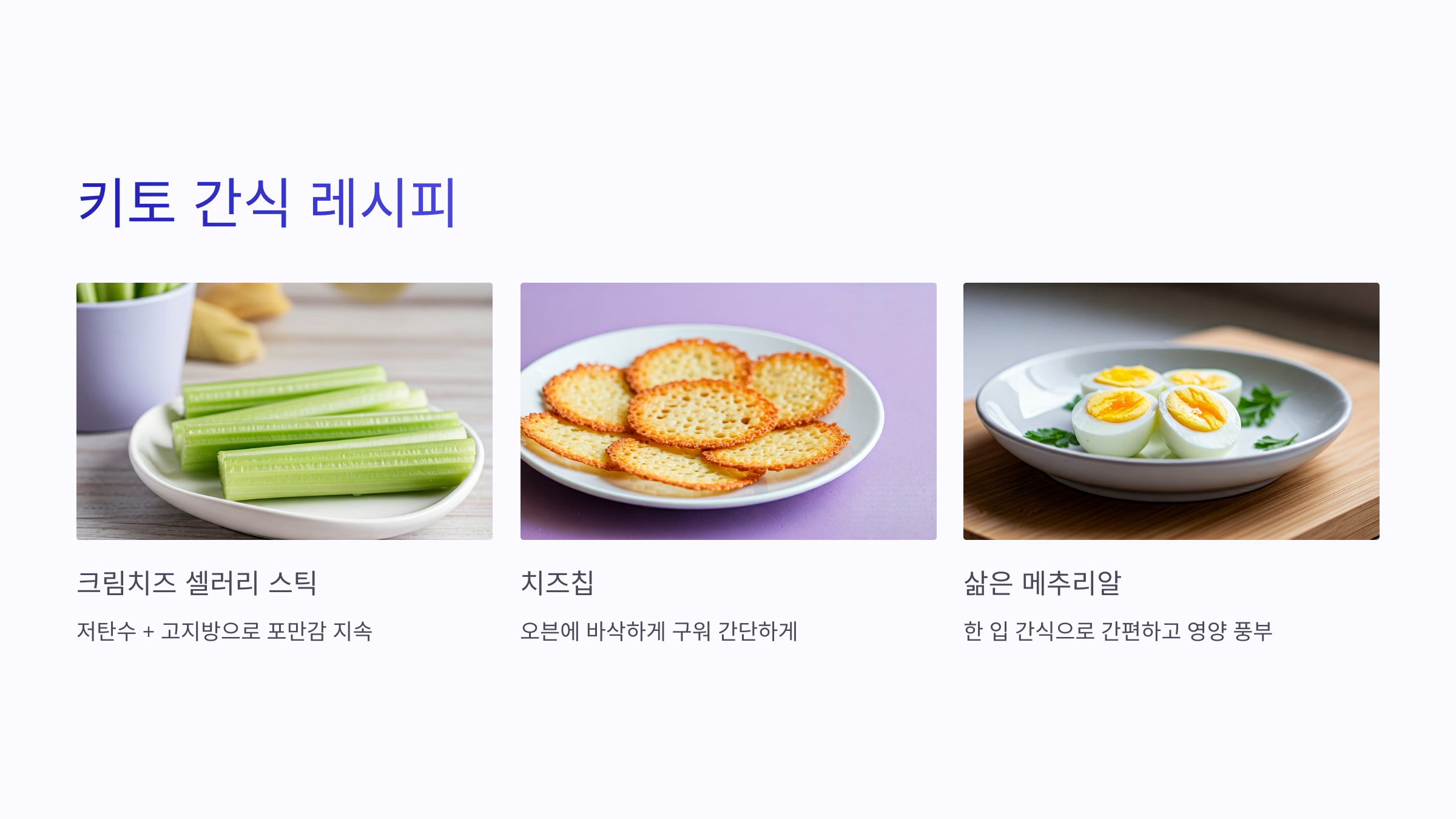| 크림치즈 셀러리 스틱 | 저탄수 + 고지방으로 포만감 지속 |