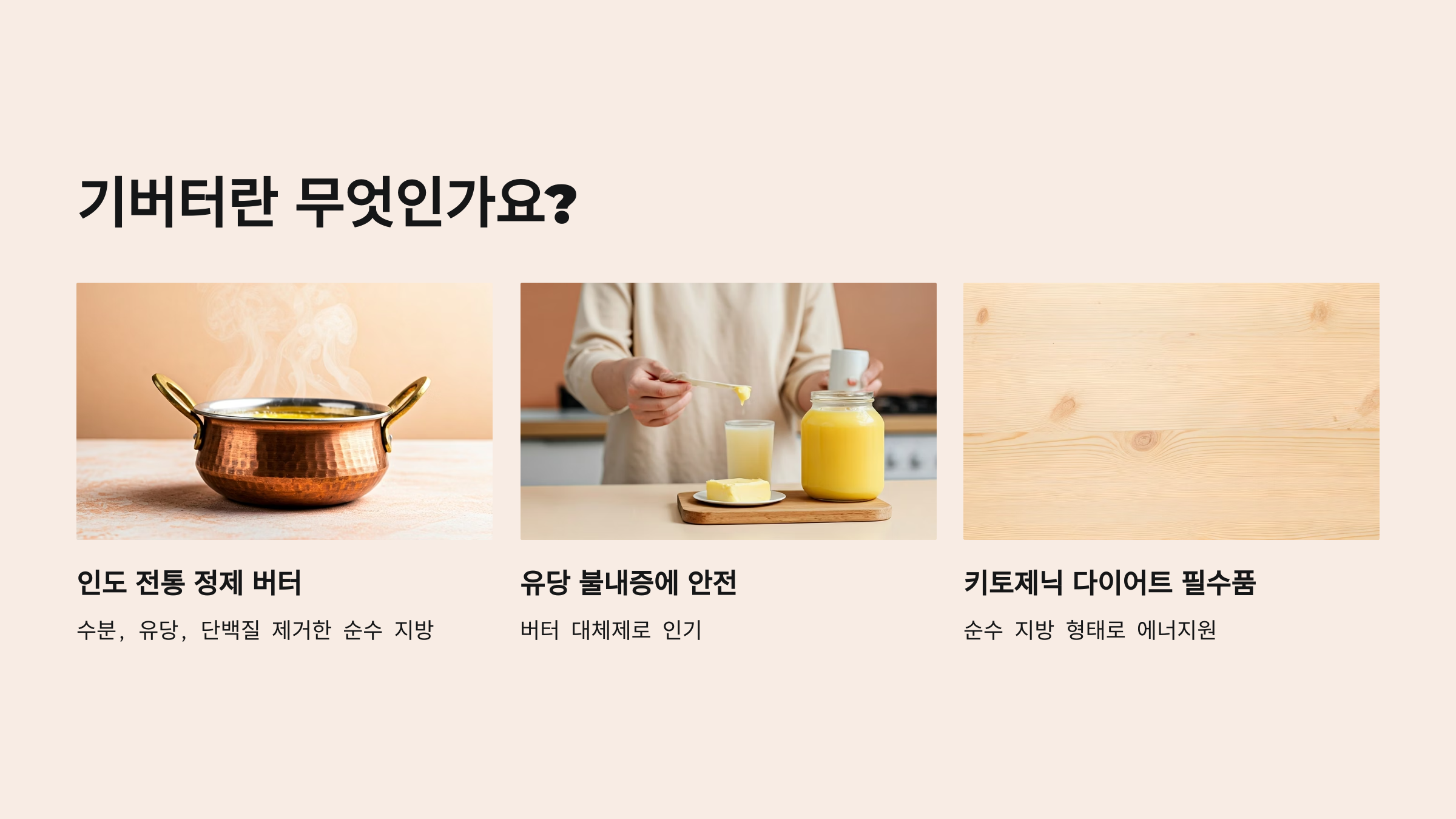 기버터(Ghee Butter)는 인도 전통 방식으로 만든 정제 버터입니다. 일반 버터에서 수분과 유당, 단백질을 제거하고 순수한 지방만을 남긴 형태죠. 키토제닉 다이어트에서 각광받는 이유는 바로 이 ‘순수 지방’ 때문이에요. 요즘엔 유당 불내증 있는 분들도 안심하고 먹을 수 있는 버터 대체제로 떠오르고 있답니다.