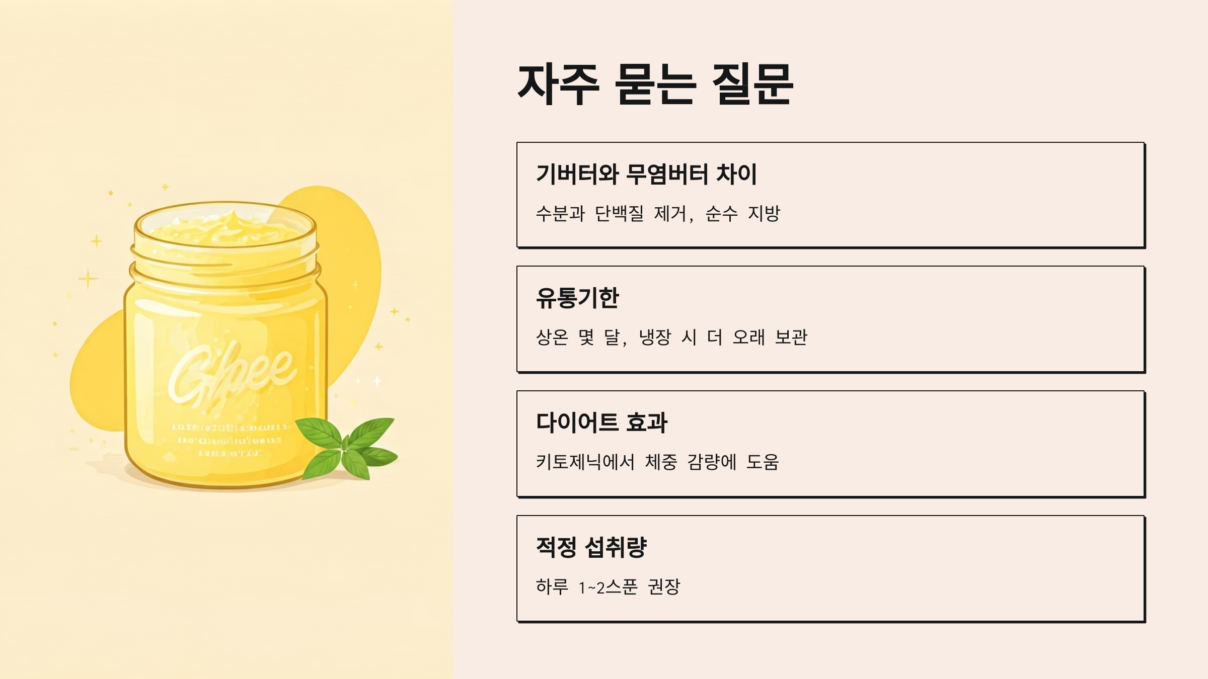 기버터는 무염버터에서 수분과 단백질을 제거해 더 순수한 지방으로 만들어진 버터입니다. 유당이 제거되어 소화에 부담이 적습니다.